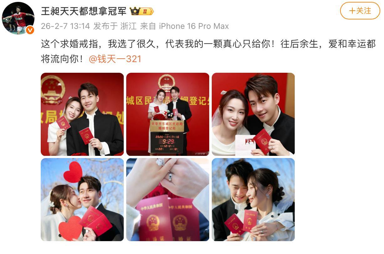 梁王 王昶求婚梁伟铿递戒指 幸福顶配不过爱人在旁、挚友见证!羽毛球世界冠军王昶戴DR官宣领证结婚喜讯,钱天一也晒出了求婚视频,原来早在钱天一生日王昶就用DR真心戒向她求婚,许下了一生爱一人的承诺!求婚现场更有梁伟铿等好友惊喜助阵,梁伟铿还当起了花童给王昶递钻戒,祝福好兄弟天长地久。王昶右手老婆左手搭档 王昶钱天一结婚