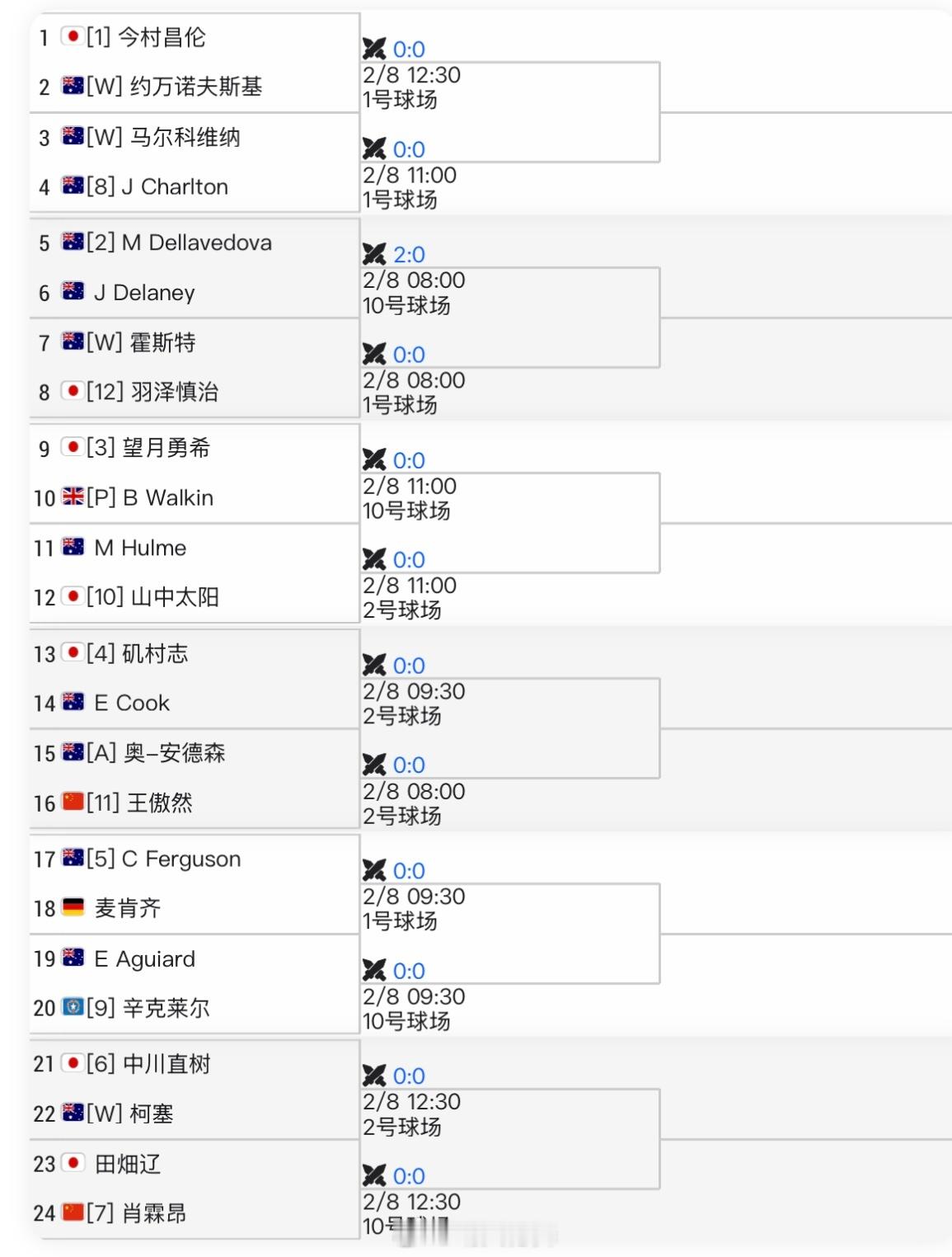 布里斯班CH75签表正赛:张之臻🇨🇳 vs 马林科夫🇦🇺周意🇨🇳 vs Tai Sach🇦🇺孙发京🇨🇳 vs 埃利斯🇦🇺