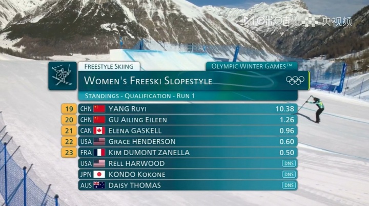 谷爱凌第二顺位出发,在落地时失去平衡摔倒。随后她坚持完成整套滑行,结束这一跳,得分1.26分。目前排在第20位。