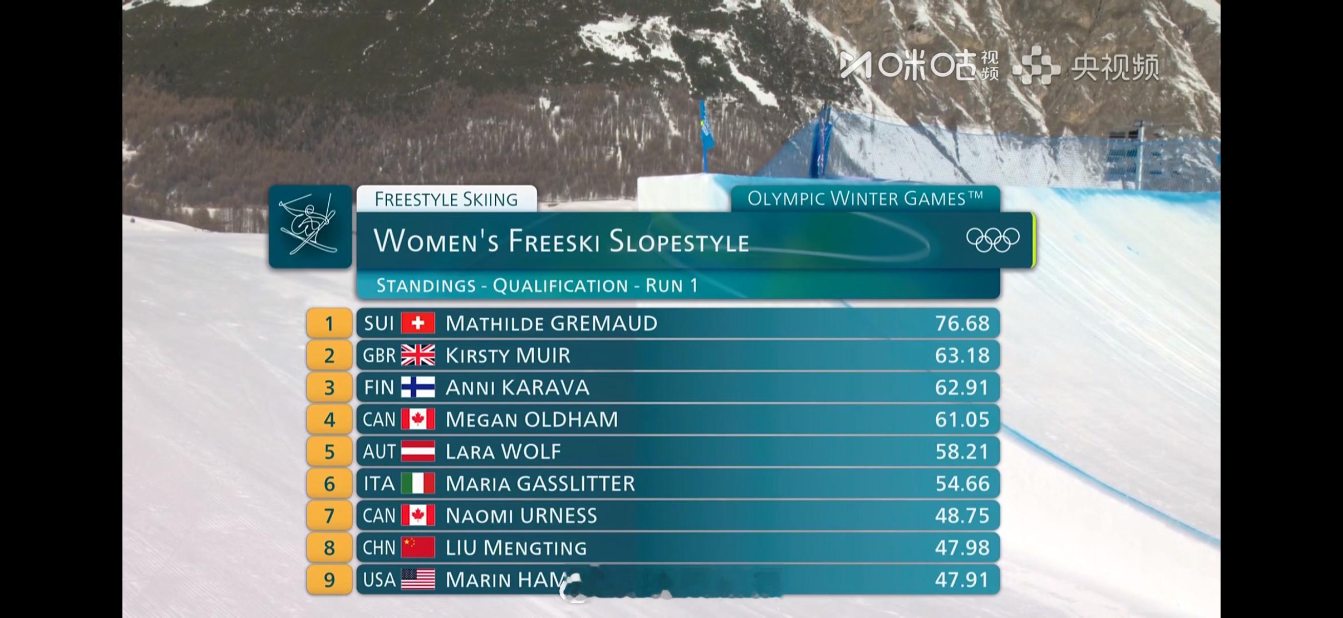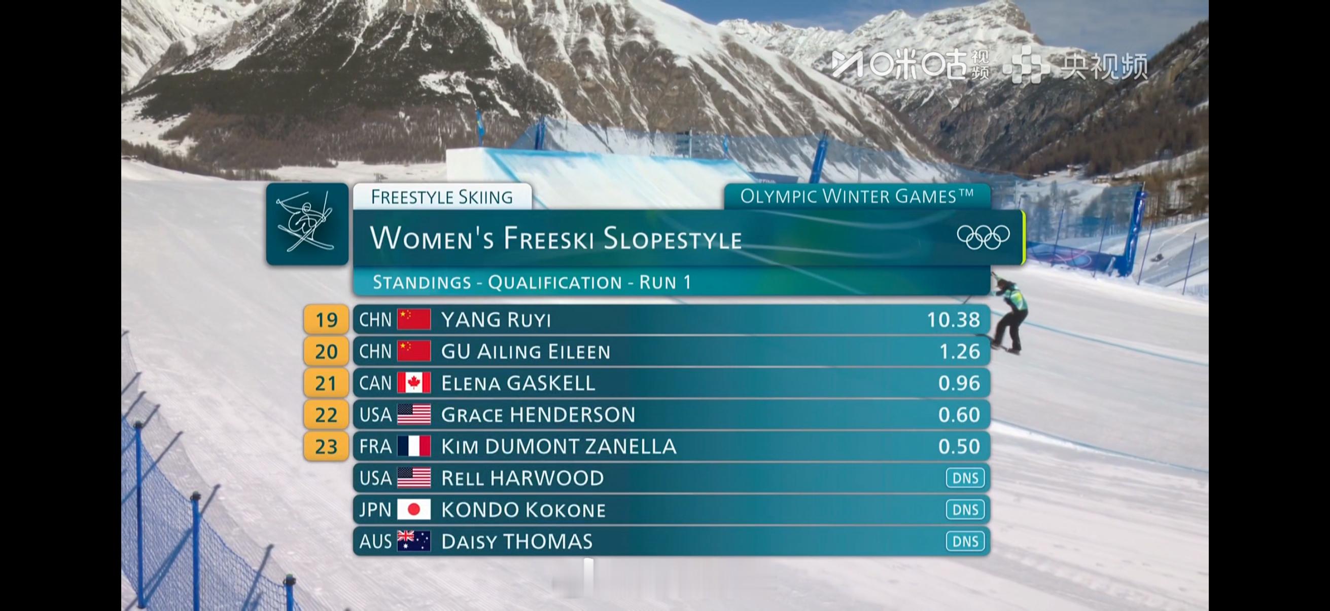 2026年米兰科尔蒂纳冬奥会自由式滑雪女子坡面障碍技巧预赛第一轮成绩(预赛两跳取最好成绩,资格赛前12位晋级)刘梦婷🇨🇳 47.98韩林杉🇨🇳 43.93杨如意🇨🇳 10.38谷爱凌🇨🇳 1.26谷爱凌第一滑摔倒