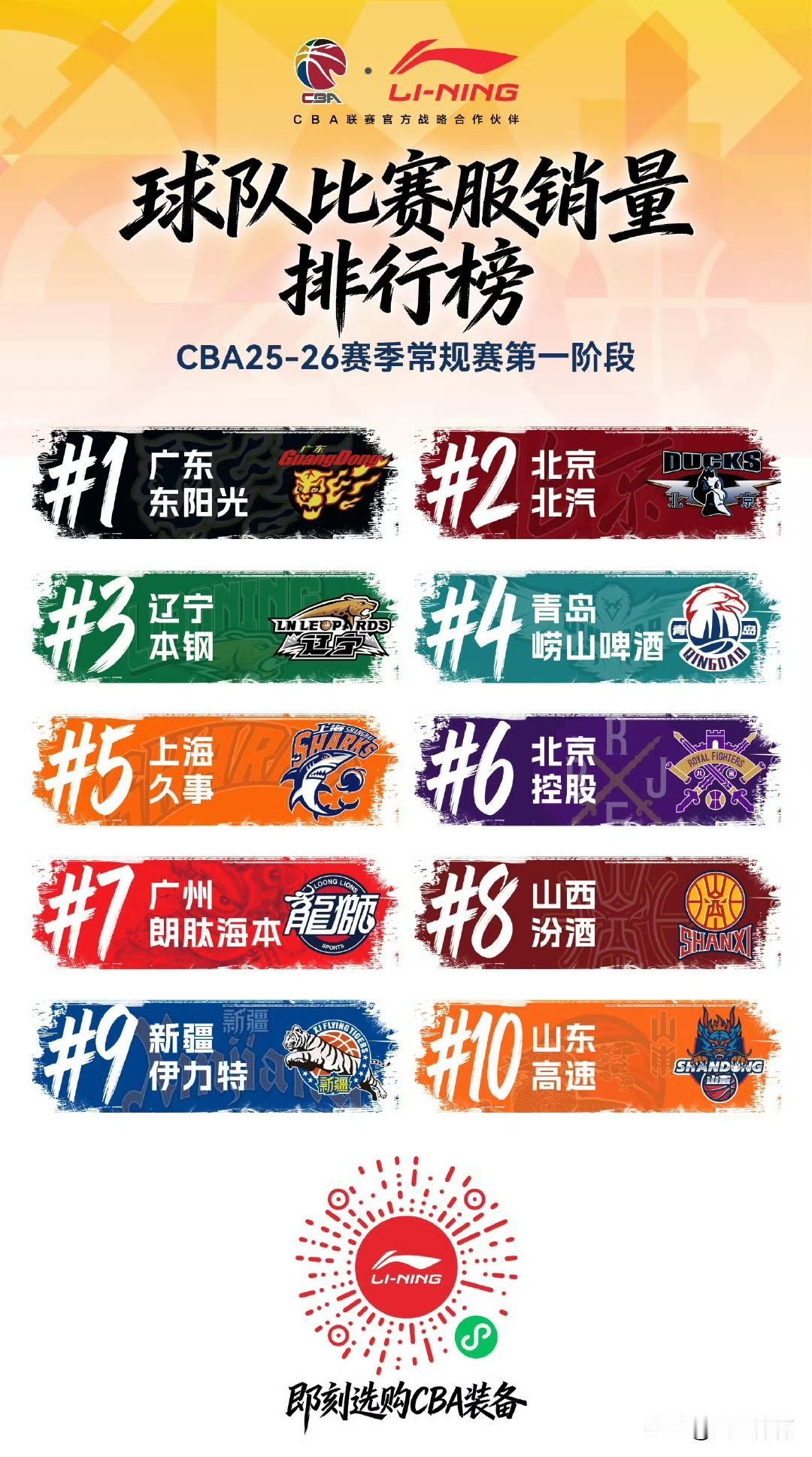 CBA常规赛第一阶段球衣销售排名揭晓! 近日,CBA联赛官方赞助商李宁公布了第一阶段的球衣销售榜单。球员层面,广东宏远的徐杰与胡明轩位居前两名,北京北汽球员赵睿排名第三。可以讲,这三名球员是当下CBA联赛当之无愧的顶流球员,不久前他们三人也都入选了全明星阵容,其中徐杰和赵睿分别荣膺南北区票王。排在4 - 10名的依次是陈国豪、赵继伟、廖三宁、张宁、陈盈骏、周琦和郭艾伦。 球队排名上,广东、北京、辽宁摘得前三。这三支球队均为联赛热门之师,青岛、上海、北控、广州、山西、新疆和山东跻身前十名。 广东男篮 北京首钢