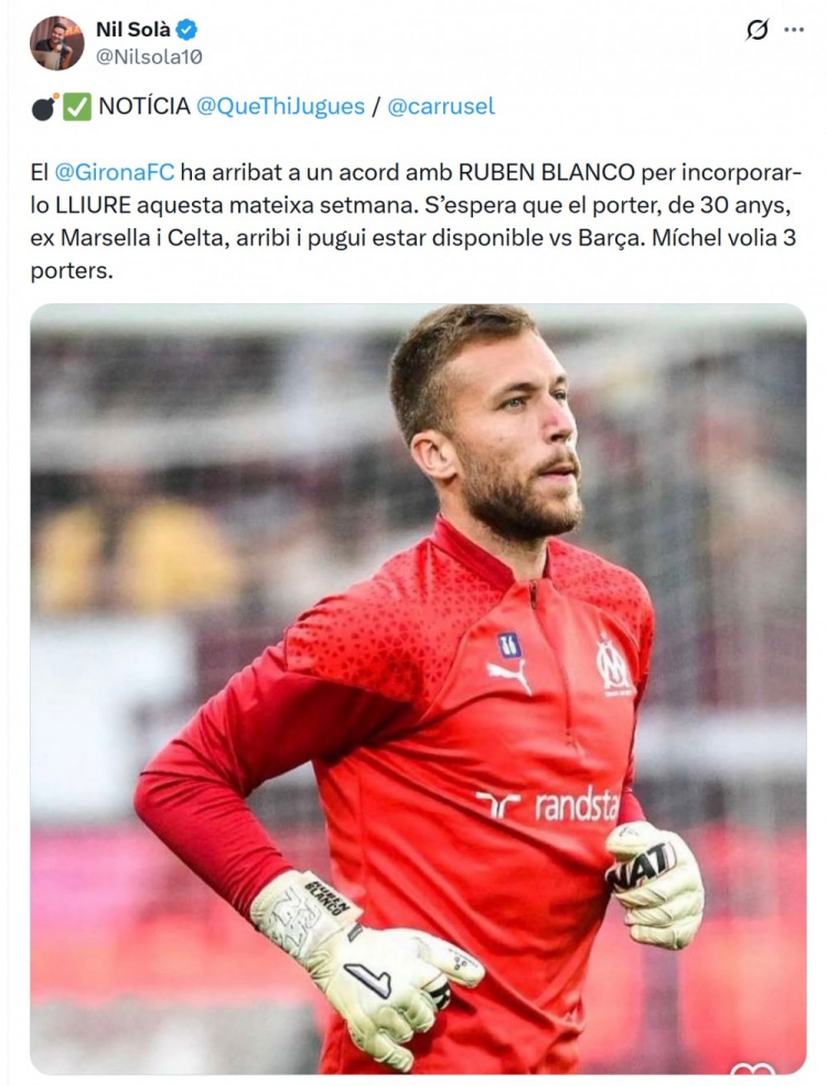 鲁本·布兰科预计将很快加盟赫罗纳,并可以随队参加对阵巴萨的比赛,赫罗纳主帅米歇尔希望阵容中拥有三名可用门将。