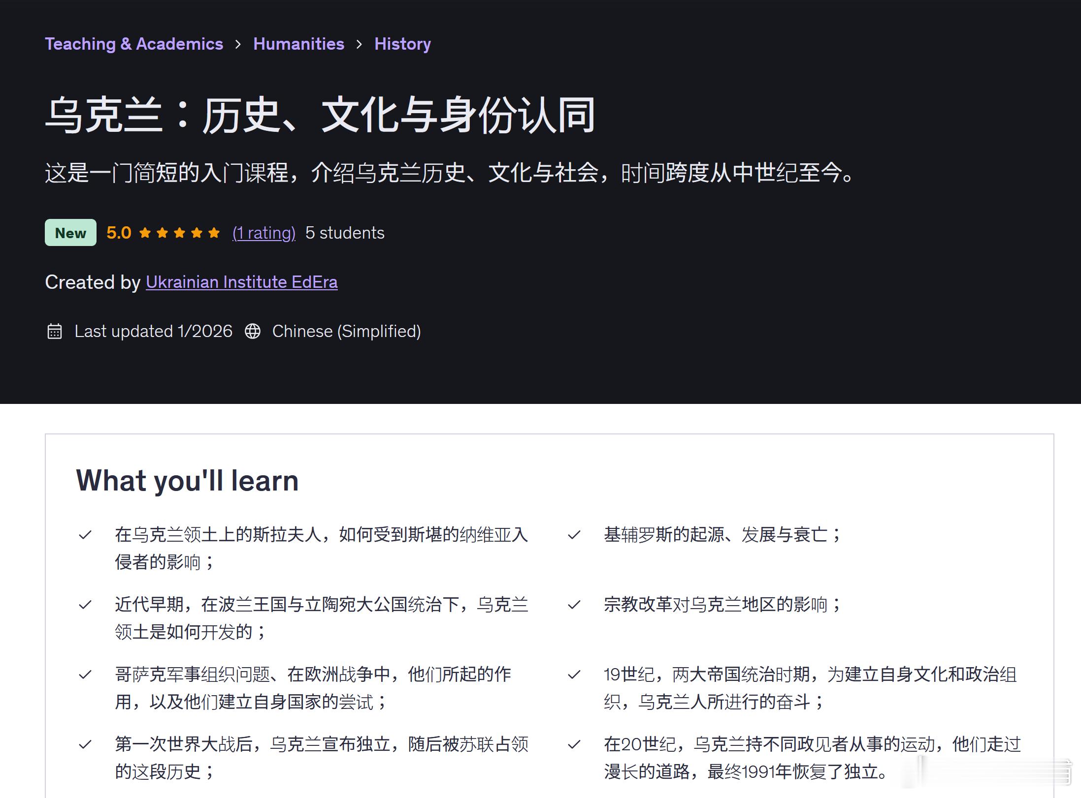 Udemy 课程《乌克兰:历史、文化与身份认同》现已推出中文版!
