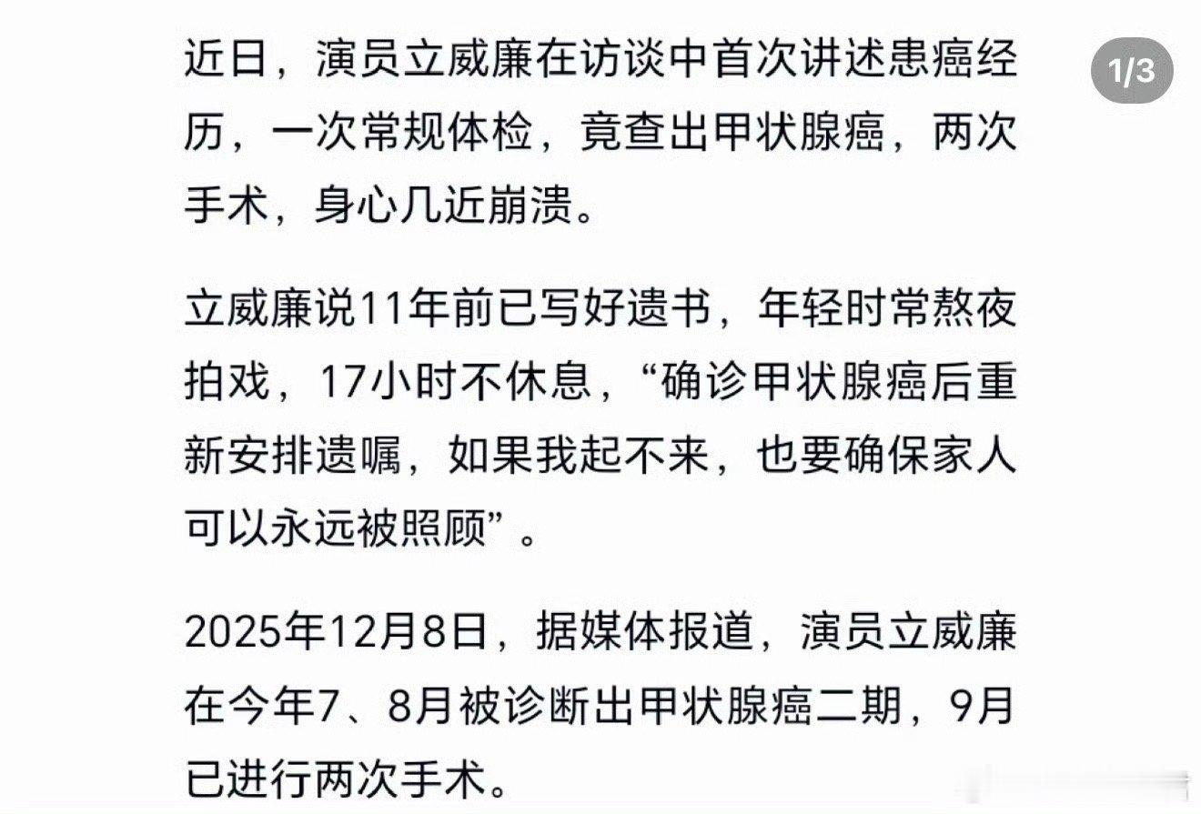 演员立威廉已重新安排遗嘱近日,演员立威廉在访谈中首次讲述患癌经历,一次常规体检,竟查出甲状腺癌,两次手术,身心几近崩溃。