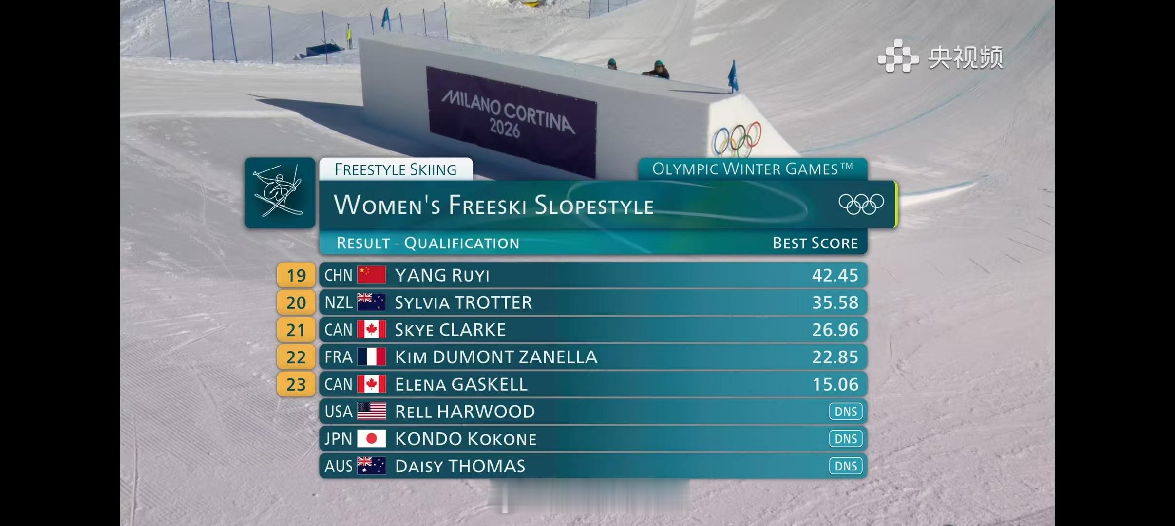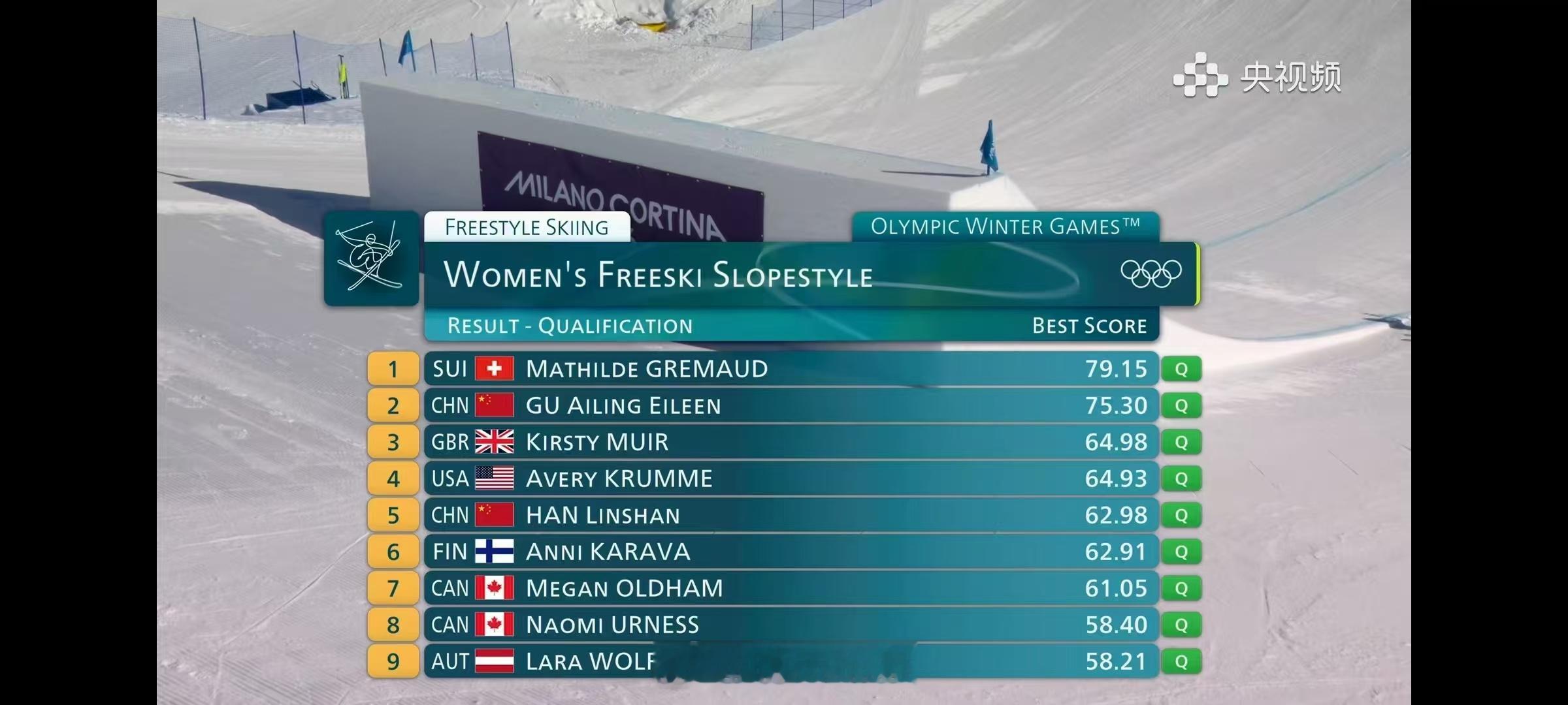 2026年米兰科尔蒂纳冬奥会 自由式滑雪女子坡面障碍技巧预赛1.🇨🇭格雷莫德79.15分 Q2.🇨🇳谷爱凌75.30分 Q3.🇬🇧缪尔64.98分 Q4.🇺🇸克鲁姆64.93分 Q5.🇨🇳韩林杉62.98分 Q6.🇫🇮卡拉瓦62.91分 Q7.🇨🇦奥尔德姆61.05分 Q8.🇨🇦厄内斯58.40分 Q9.🇦🇹沃尔夫58.21分 Q10.🇨🇦坦诺57.01分 Q11.🇨🇳刘梦婷55.10分 Q12.🇮🇹加斯利特尔54.66分 Q——————资格赛前12名晋级决赛13.🇨🇭赫夫林54.50分,平昌冬奥会该项目冠军赫夫林卡在第13无缘决赛19.🇨🇳杨如意42.45分中国三人晋级坡障决赛谷爱凌韩林杉刘梦婷晋级谷爱凌预赛第2进决赛
