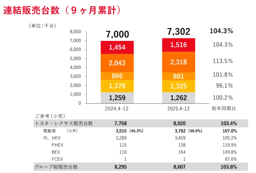 但现实却异常冰冷。2025前三季财报显示,丰田2025年4月到12月纯电动车的销量为16.4万辆,虽然同比有所增加,但与此前的目标相去甚远。而第三季度的销售数据显示,丰田汽车虽然同比增加5.7%,但营业利润却同比暴跌21.3%。而且在日本本地、美国、欧洲、亚洲等传统汽车市场,丰田汽车利润同比都下降,特别是在北美,受关税影响,同比缩水44.8%。而主要的利润增长点在中南美洲、非洲等地区。