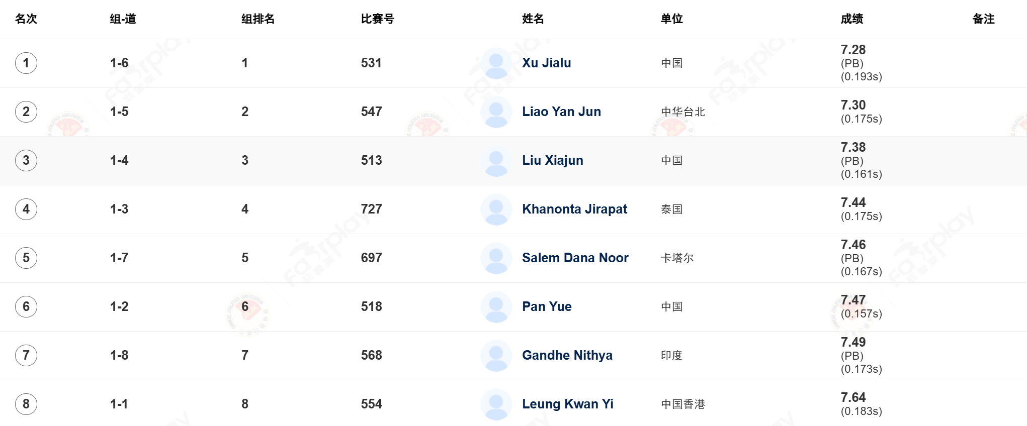 中国台北选手廖晏均跑出7秒30获得亚军,另一位中国选手潘越以7秒47获得第6。