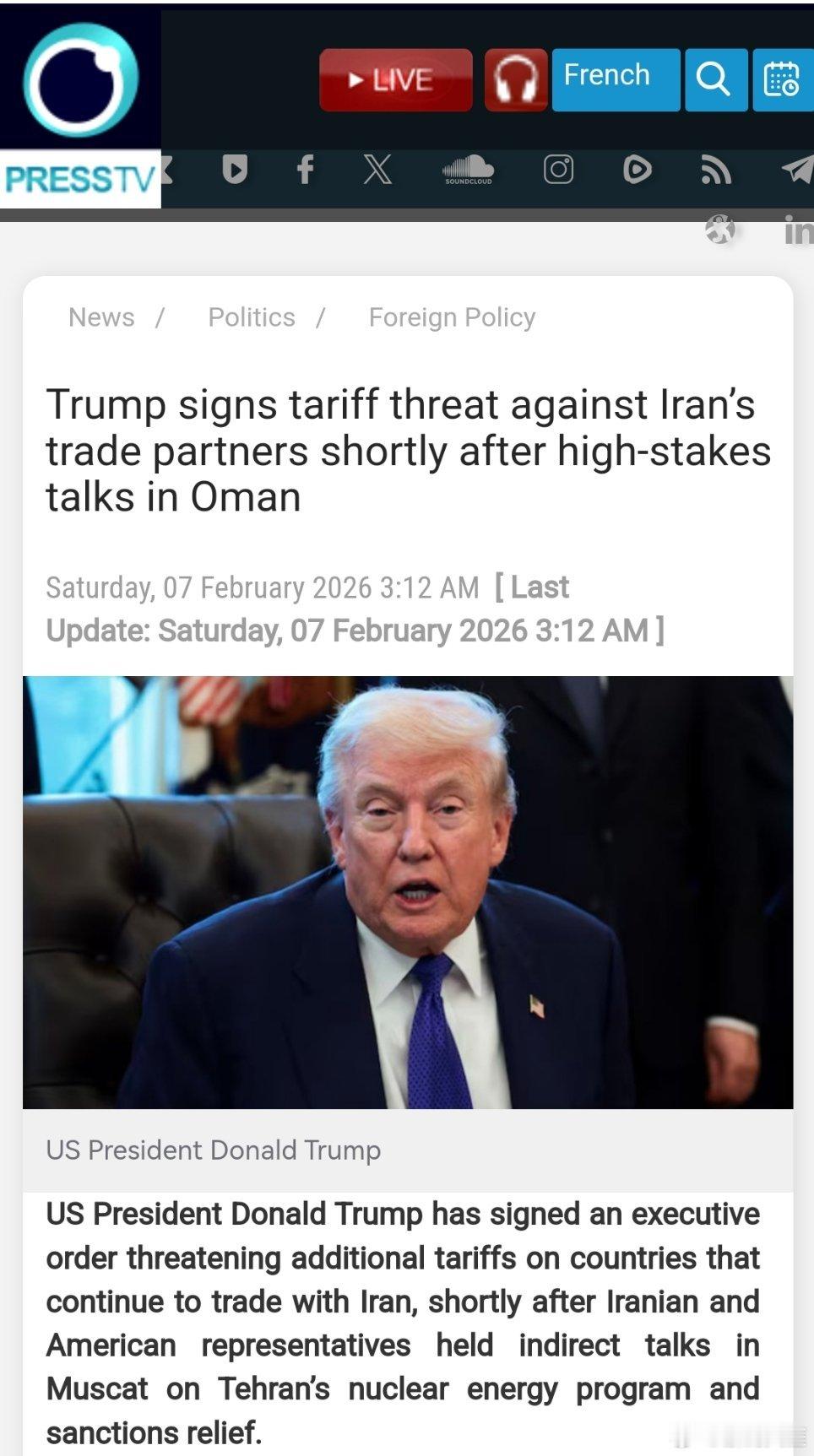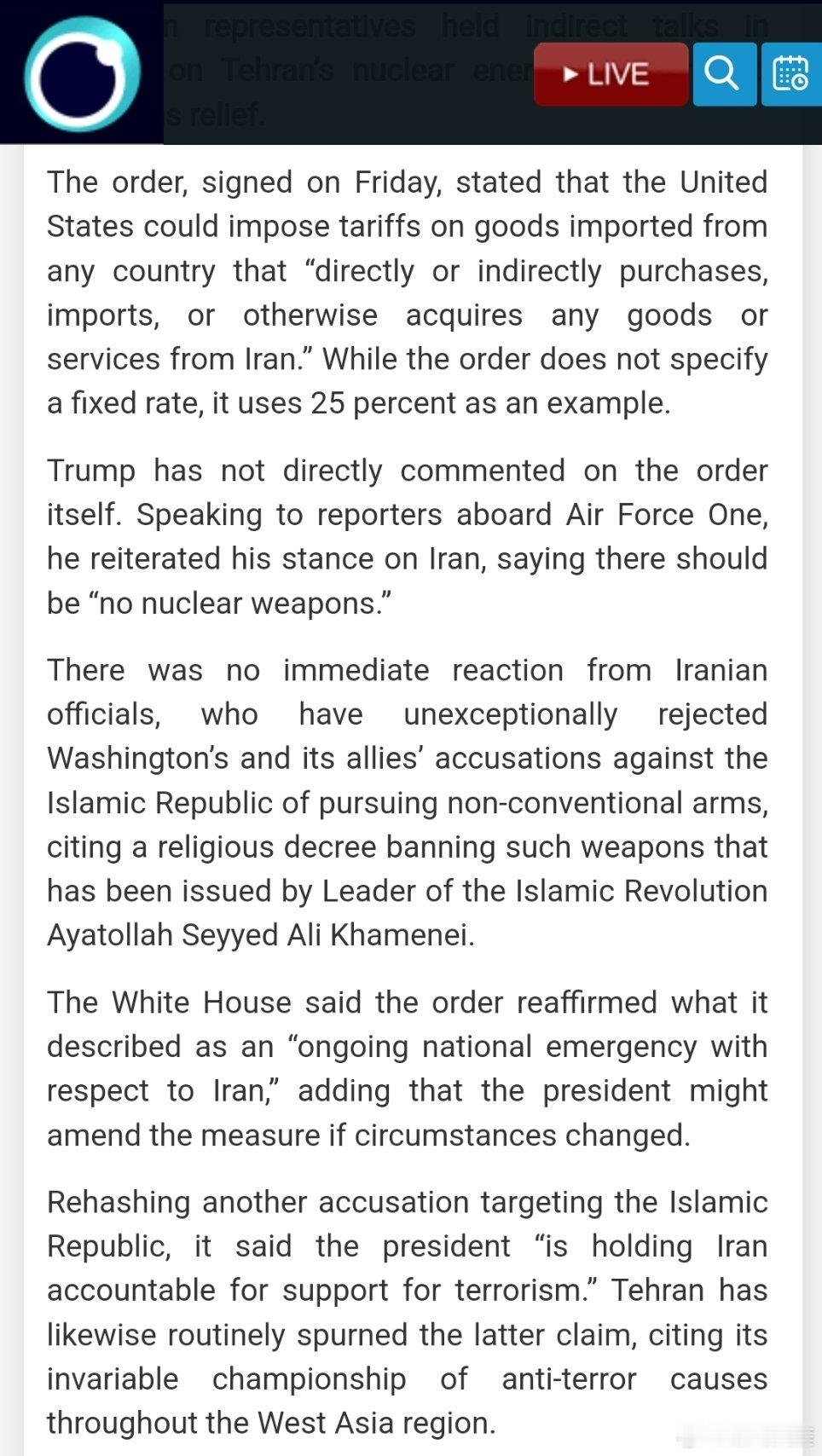 唐纳德·特朗普刚刚签署了一项行政命令,威胁要对继续与伊朗进行贸易的国家征收更多关税。此前,伊朗和美国的代表在马斯喀特就德黑兰的核能项目及制裁解除问题进行了间接会谈。(伊朗官网)