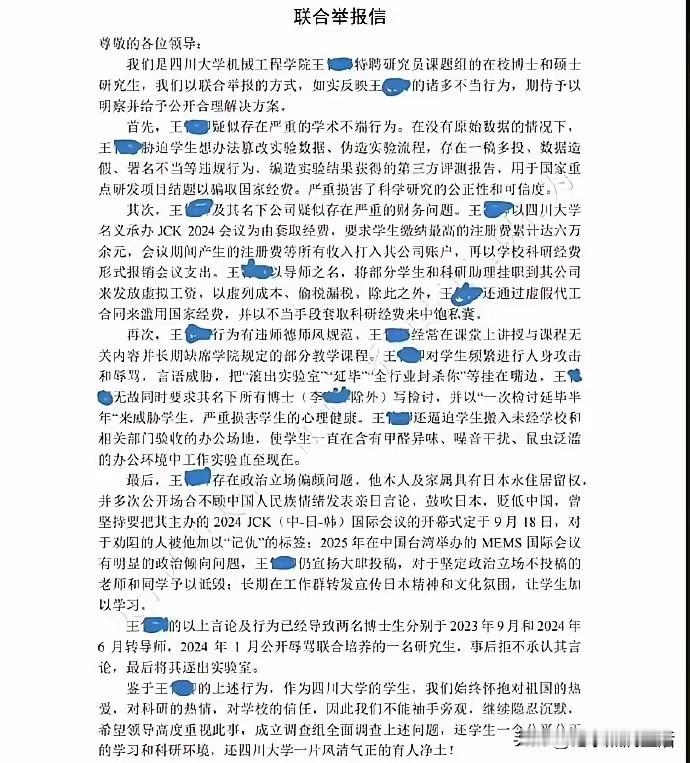 几十万川军的亡魂如何安息,这片热土在当年没被日本征服,现在又安插王竹卿这样的精日分子,想从思想上来征服川军的后代。 只要川军精神和川军魂在,就容不得他们放肆,即使是学霸级别的教授也没用,也不能用“权威”吓倒这里的人民,品行不端,依然联名举报。 83页的举报材料更像是对这些劣迹教师宣战的战旗,也更像是当年千里奔徙抗日的绝唱,更是四川人民不畏强权的具象化体现。 国家花了巨额财富和十几年的精力培养的人才,留学日本后,据网友爆料,已经取得日本的永久居住权,一个教育工作者,如果不是纳了什么投名状,又是如何轻易获得一个国家的永久居住权的? 他有别国的永久居住权,却不在那边工作,而是跑到四川大学当教授,难道真的是为了挣那点工资么? 在四川这里,他晚上是如何敢出门的呀,如果真有日本的永久居住权,真应该好好调查一下了,绝不能放过一个坏人。