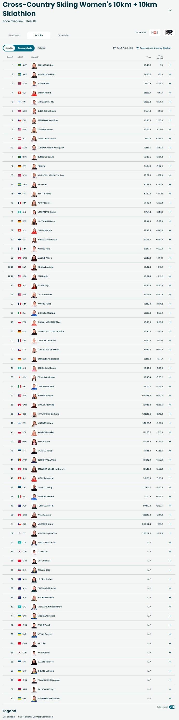 直播吧2月7日讯米兰冬奥会越野滑雪女子10公里+10公里双追逐项目,瑞典选手包揽冠亚军,4明中国选手均无成绩。