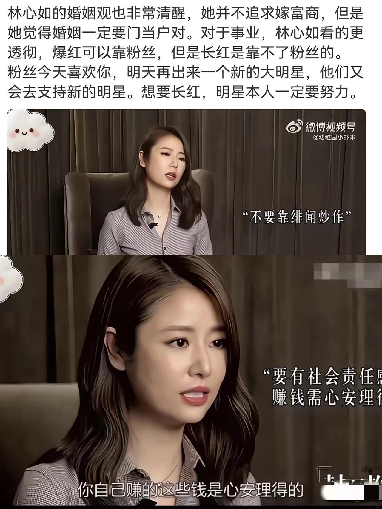 林心如,给所有明星上了一课! 2月7日,结婚9年的她凭通透三观冲上热搜,不炫富、不秀恩爱,句句都是人间清醒。她坦言不攀附豪门,婚姻看重的门当户对,从来不是财富家境,而是三观同频、教养契合。 与霍建华从好友变伴侣,事业势均力敌,生活财务独立、互相兜底,既保有自我又彼此支撑,这才是长久婚姻的底气。事业上她更看得透:爆红靠运气与粉丝,长红只能靠自己。从紫薇到转型制作人,她用一部部作品打破质疑,红了近30年仍稳站舞台。 不依附、不盲从,把婚姻与人生都握在自己手里,这份清醒与独立,正是娱乐圈最稀缺的质感,也值得所有人学习。
