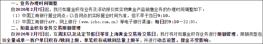 另外,部分银行于近期调整黄金相关规则。其中工商银行自2026年2月7日起,在周末以及法定节假日等非上海黄金交易所交易日,将对如意金积存业务进行限额管理,限额类型包括全量或单一客户单日积存/赎回上限、单笔积存或赎回总量上限等,并进行动态设置,提金不受影响。
