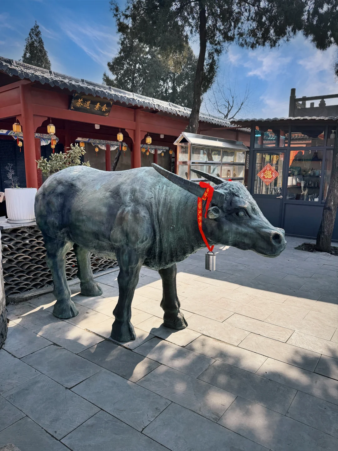 🐂道观占地约40亩,分中院、西道院、东道院三部分,含山门广场、青牛雕像(老子坐骑象征)及放生池,整体依山势而建,红墙黛瓦,静谧古朴。