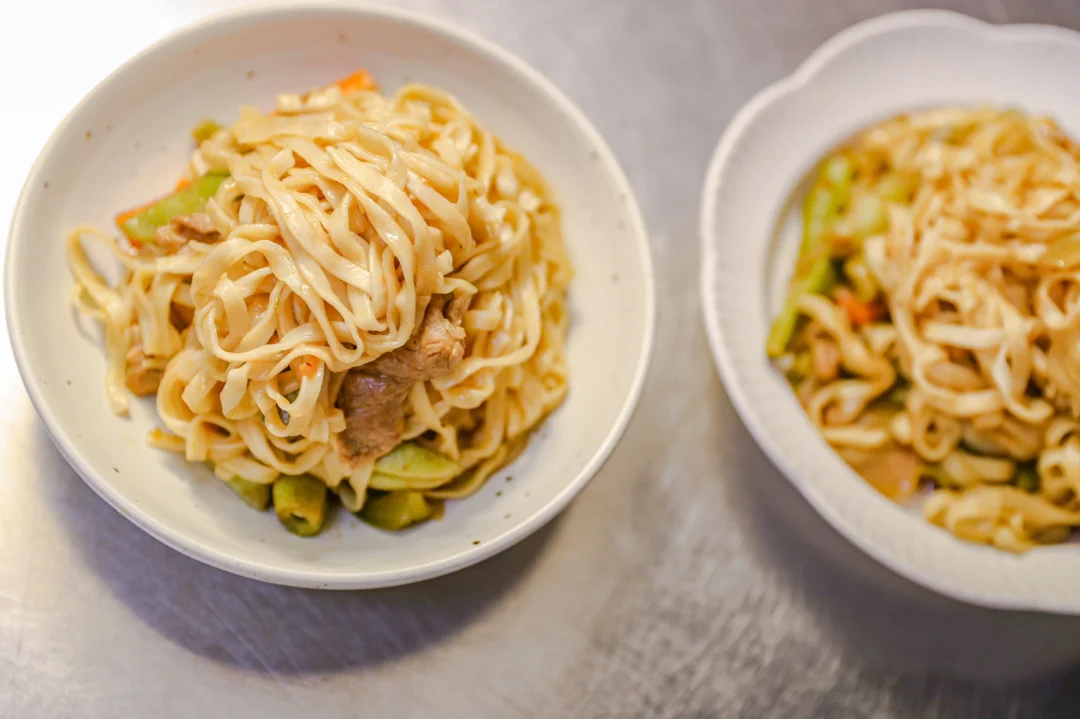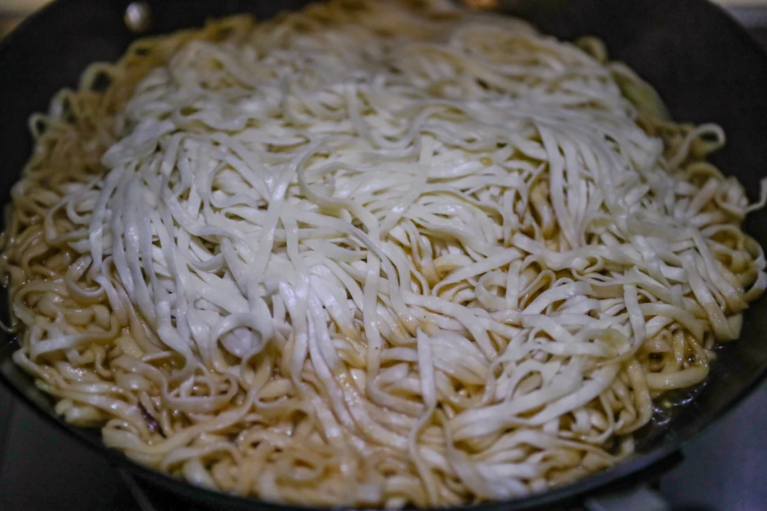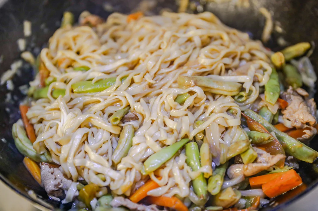 5.时间到了之后,一手拿筷子,一手拿铲子,让面条和汤汁均匀融合,面条完全吸收了扁豆的汤汁。