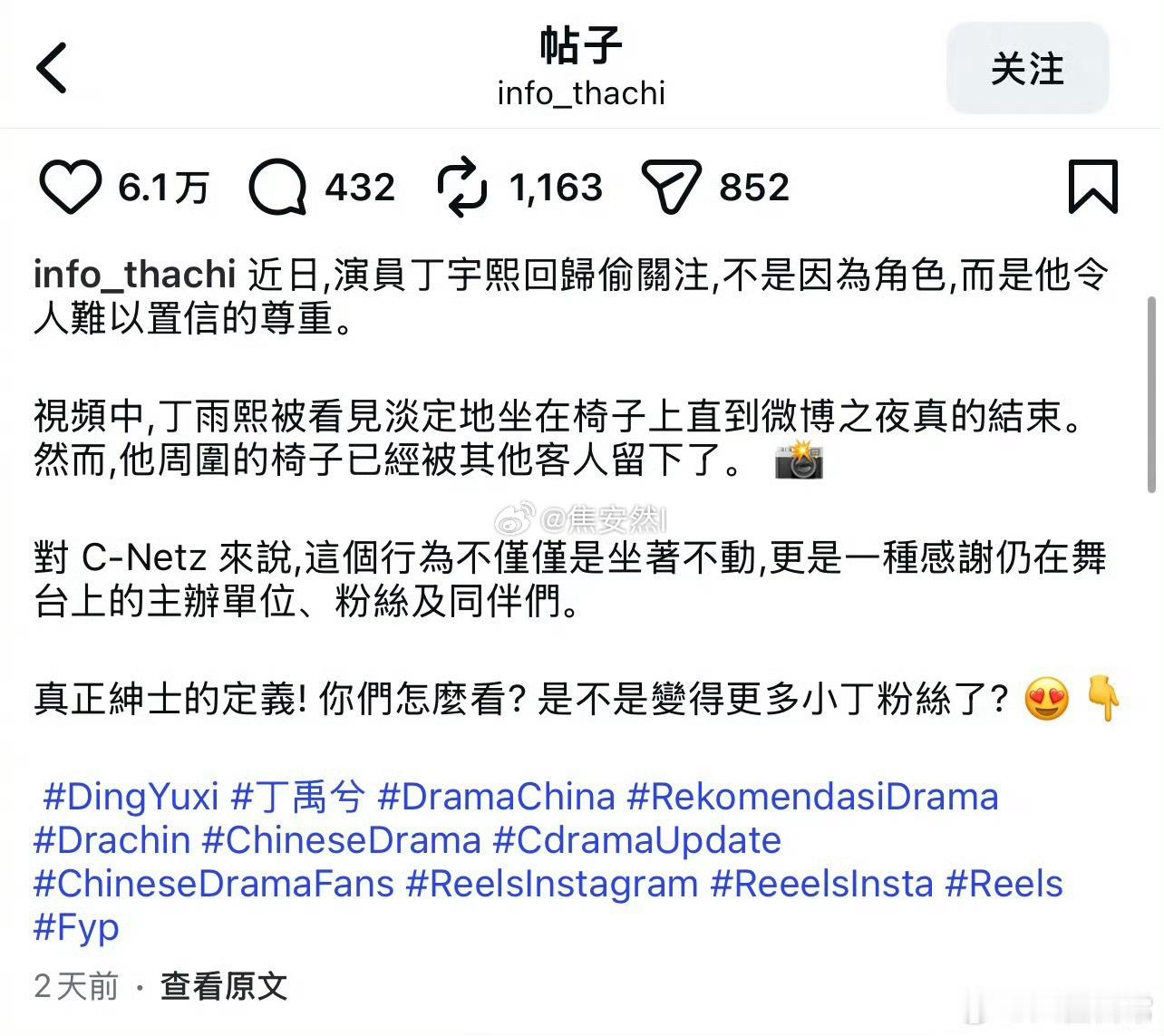 丁禹兮继送黄金在韩网出圈之后,微博之夜留到最后也在韩网出圈了。