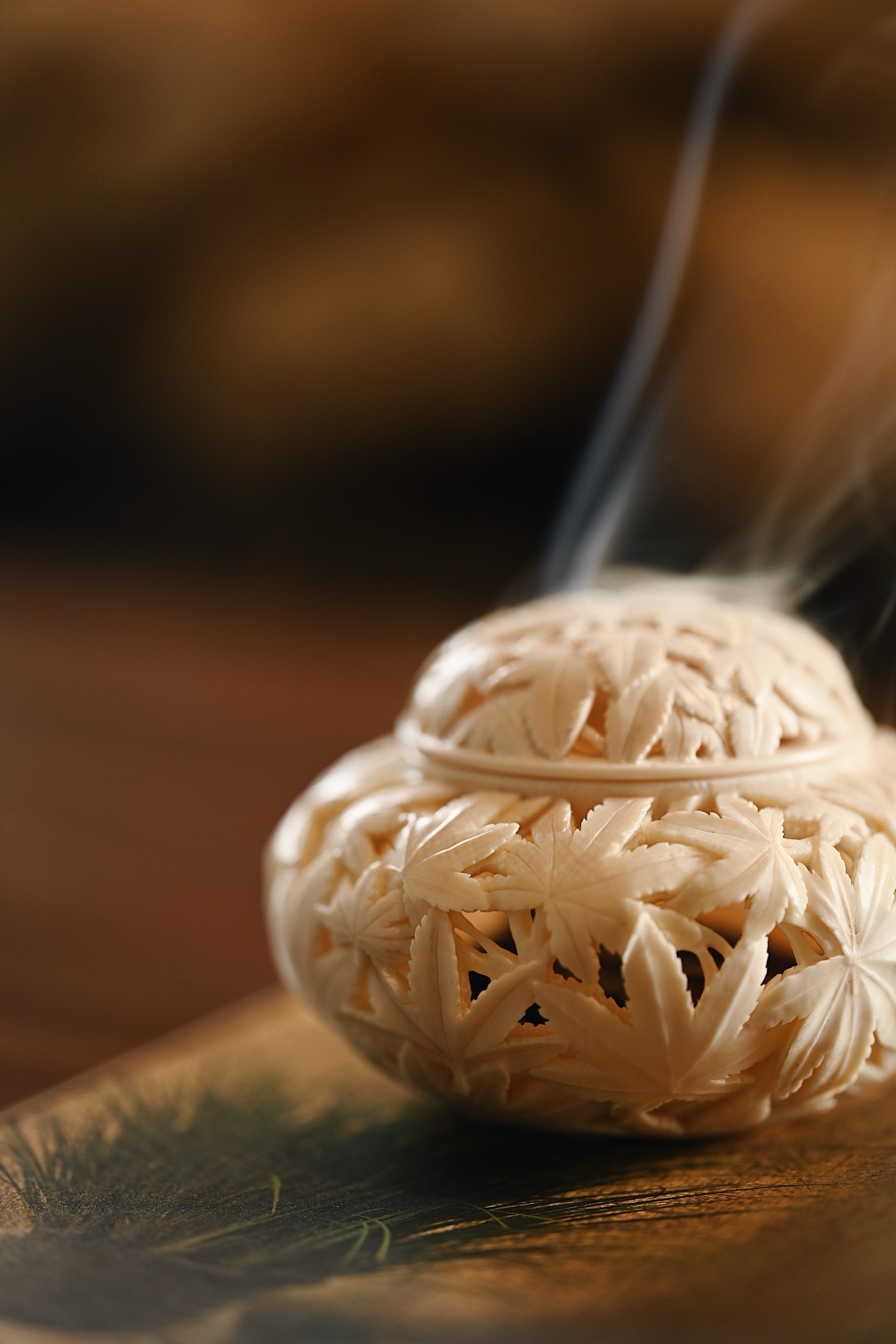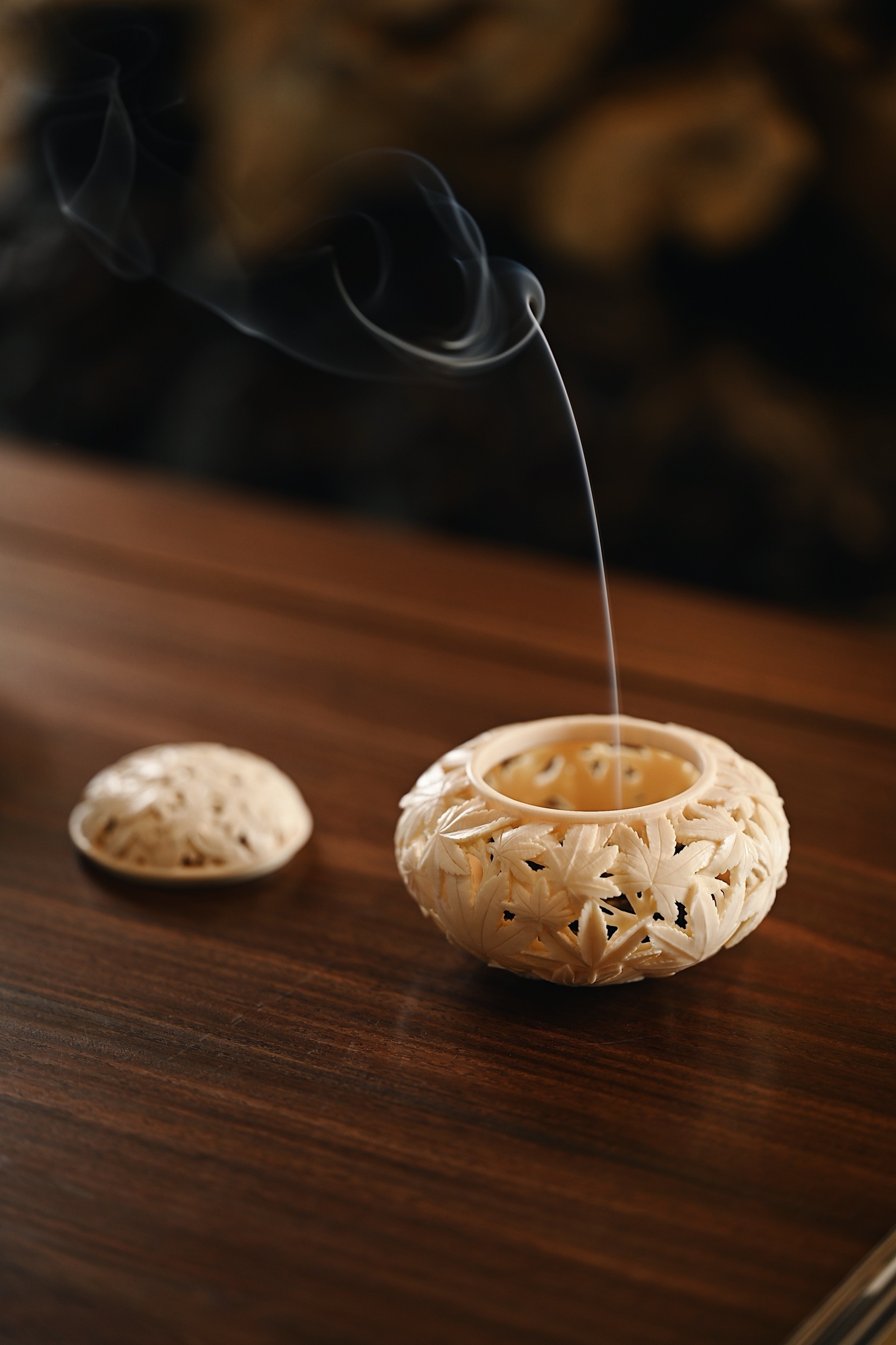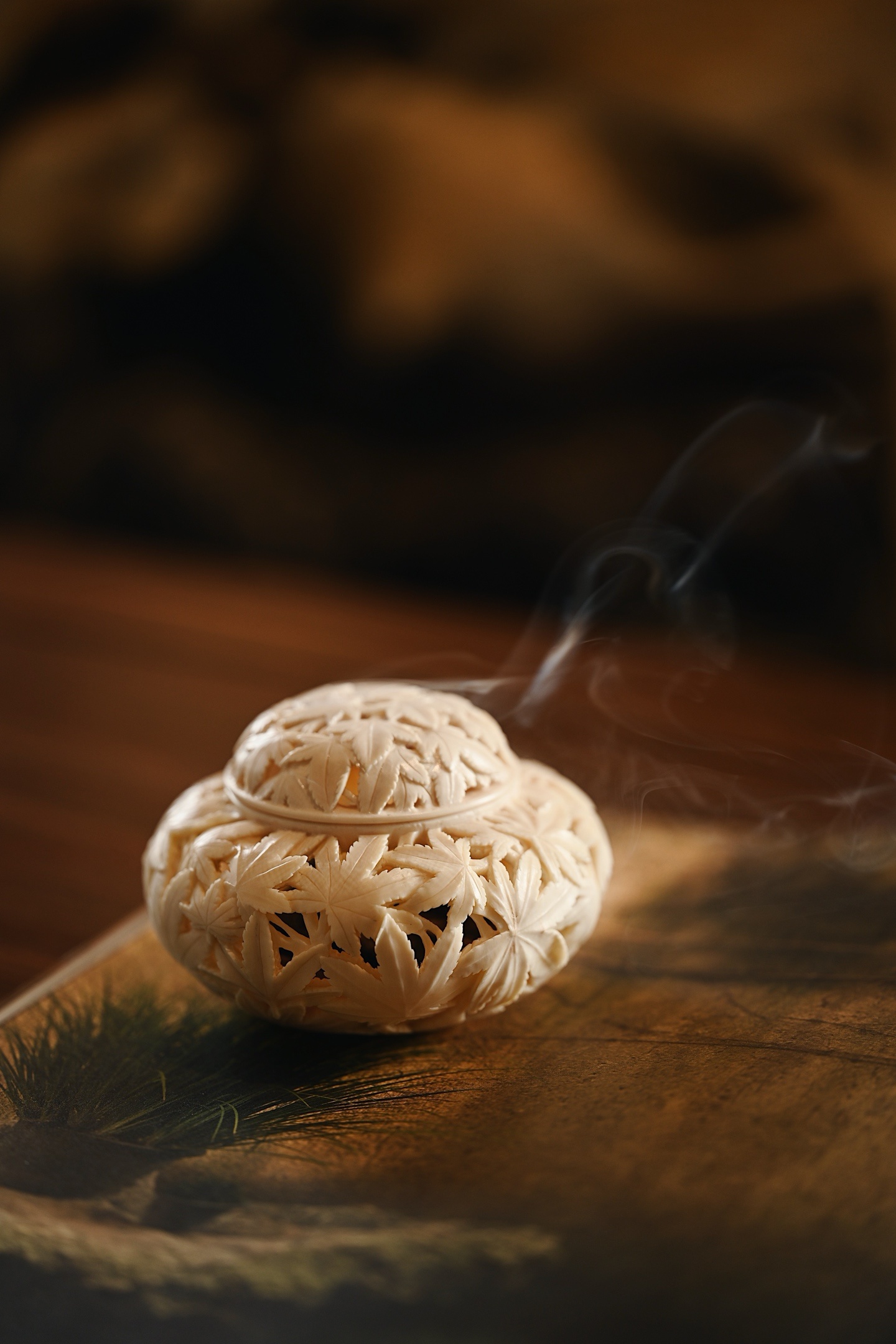 整料镂空雕刻,工艺细腻精致,枫叶层层叠叠,姿态轻盈飘逸,片片飞舞似落花飘舞,焚香青烟起,有诗意浪漫之感。