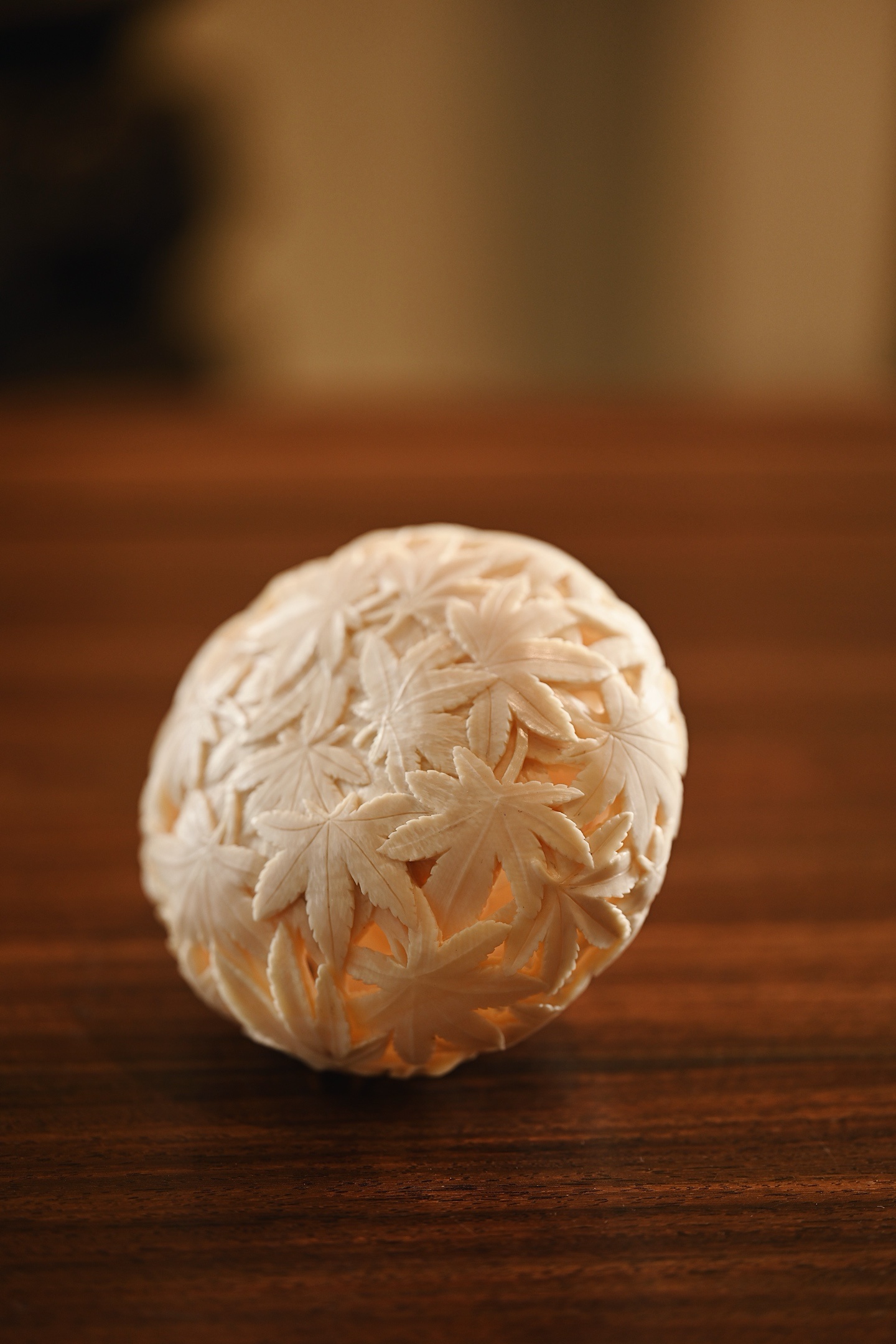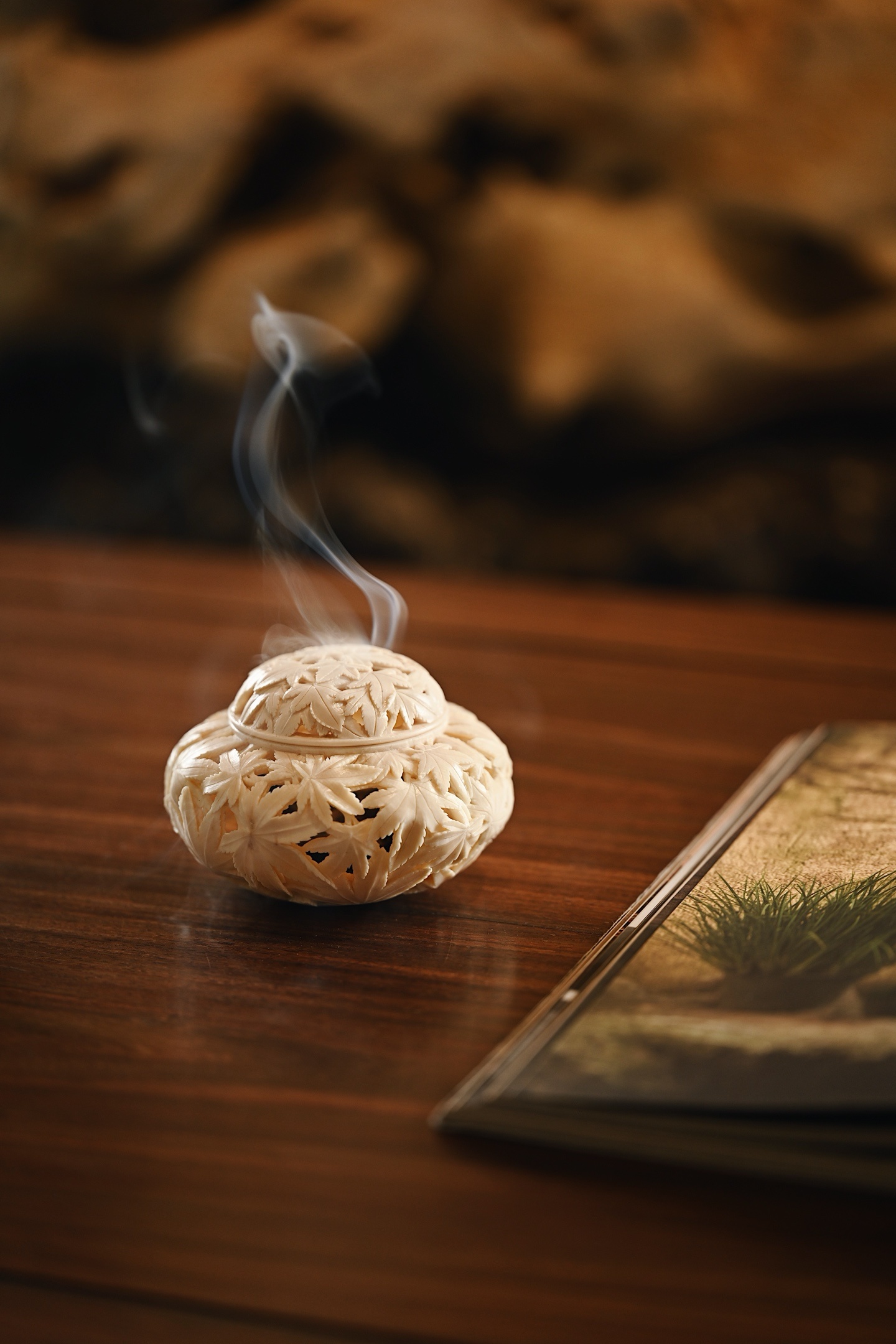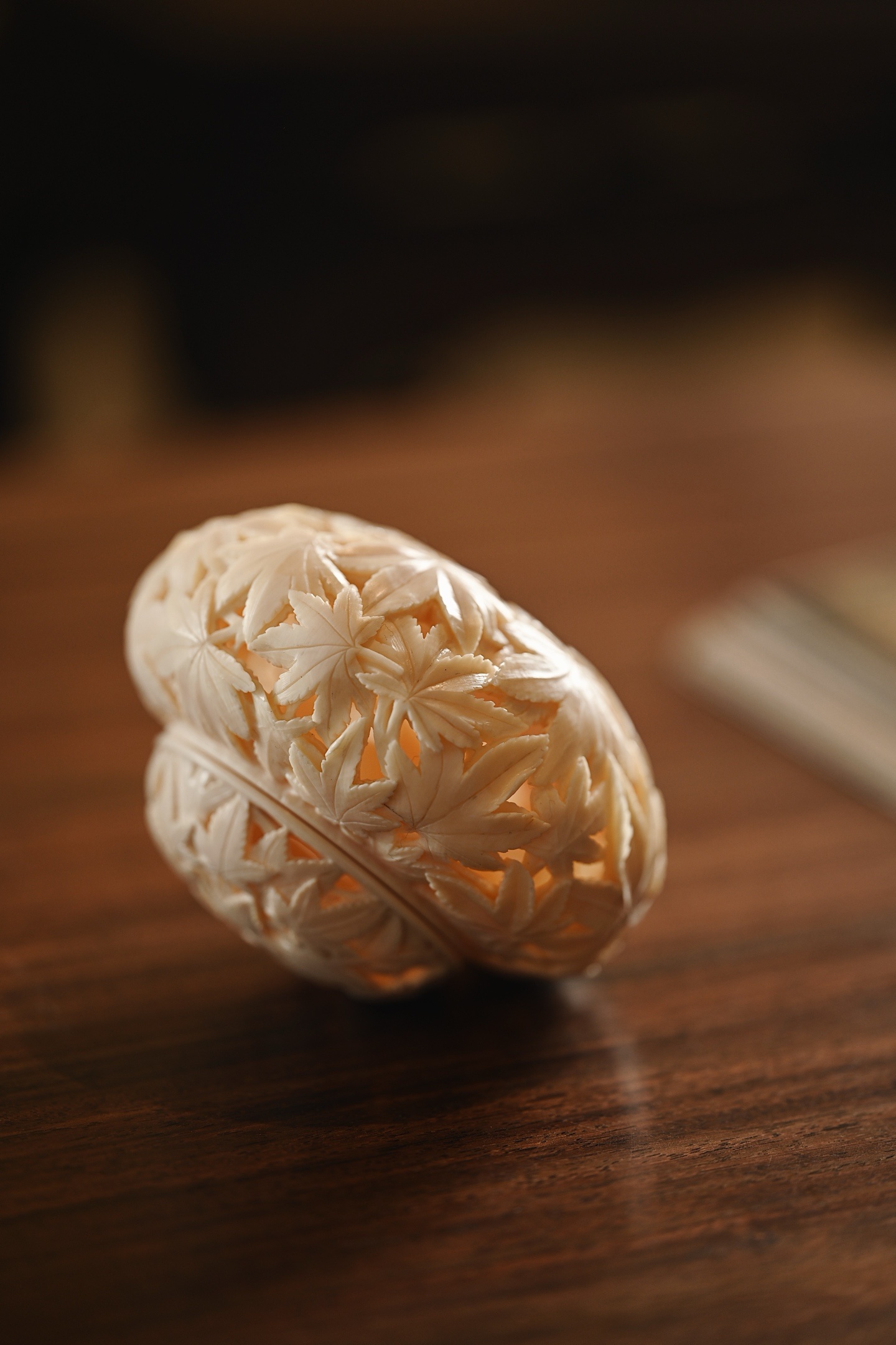 整料镂空雕刻,工艺细腻精致,枫叶层层叠叠,姿态轻盈飘逸,片片飞舞似落花飘舞,焚香青烟起,有诗意浪漫之感。
