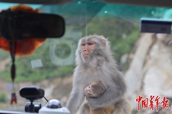 2024年8月,西藏自治区山南市。游客在219国道上偶遇野生猴群,停车观看时,带着幼崽的母猴爬上了汽车前窗。中青报·中青网记者余冰玥/摄