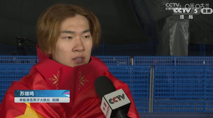 米兰冬奥会单板滑雪男子大跳台决赛,苏翊鸣总分168.5分获得铜牌。赛后他接受采访。