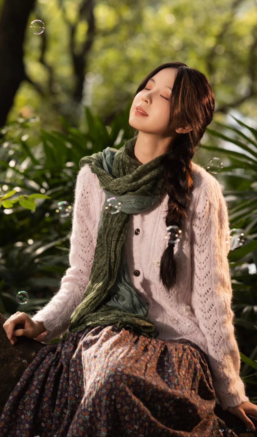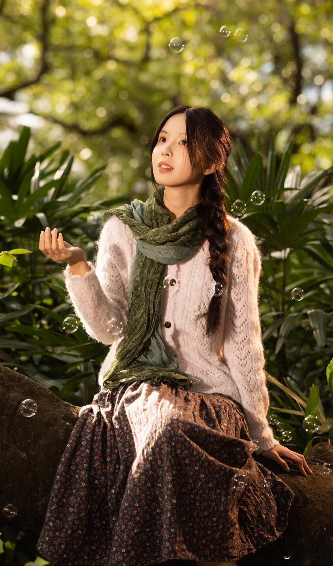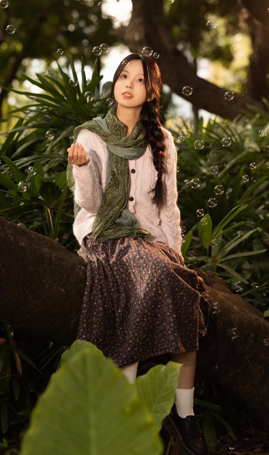 梦幻森林中的少女,吹着泡泡,享受宁静时光。