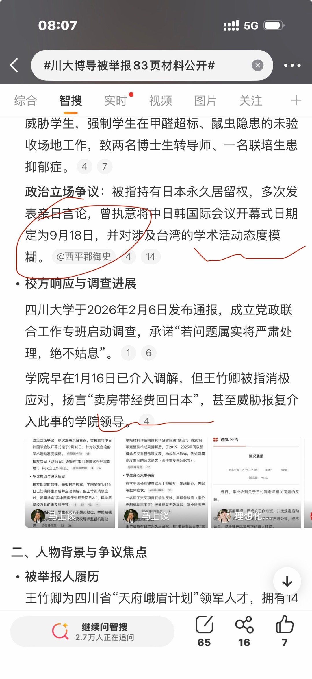 川大博导被举报83页材料公开看到川大机械工程学院博导王某卿被学生83页材料举报,对其篡改数据、一稿多投的学术不端,套取经费、师德失范等问题,说实话早已见怪不怪,只觉心寒。但得知其政治倾向模糊,还将涉日韩的学术会议定在9月18号,这一点实在忍无可忍。学术不端是职业底线失守,而漠视国耻、价值导向偏差,就是从根上烂了。918是刻在每个中国人骨子里的国耻日,这样的安排绝非无心之失,而是对历史的漠视、对民族情感的践踏,这比任何学术和师德问题都更触碰到底线。