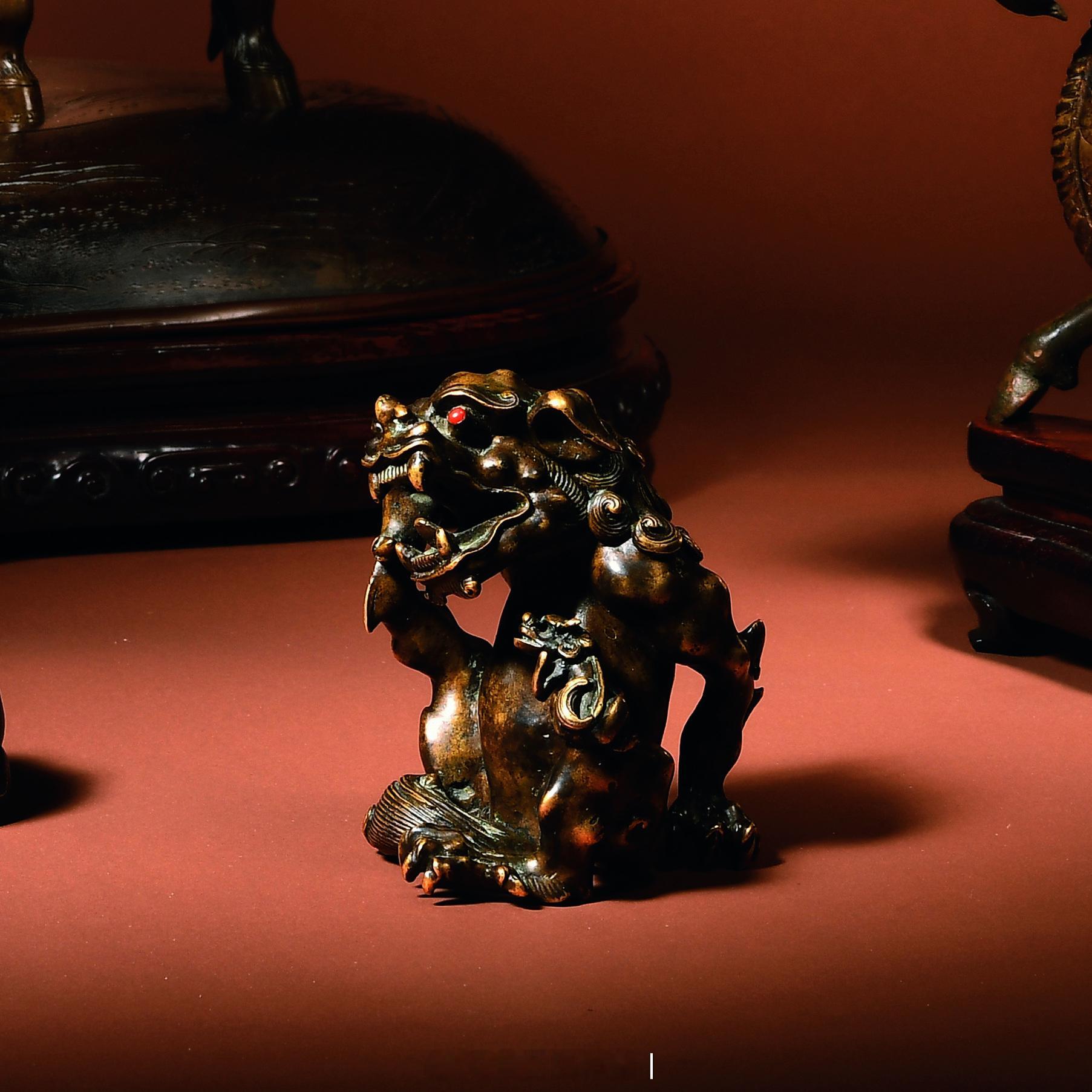 器作双狮形,以精铜为材熔铸錾刻而成。整体由一大一小两只狮子组成。其中大者作蹲坐嘶鸣状,其高额凸吻,粗眉赤目。鼻尖突起上翘,阔口大张,獠牙尽露,似鸣似啼;其以右前肢和左后肢支撑于地,左前肢收于后背,而左后肢高举至左腮一侧,指爪劲健,一副凶猛狰狞模样。其尾如帚,自然卷扫于地。在其右后肢膝上,一只小狮子攀附其上,身形较小,憨态可掬。“太师少师”是我国古代帝王之师和太子之师之简称,是辅佐帝王和教导太子的导师,使人们心目中博学广识的代表,是身份地位的象征。在我国明清时期,常以谐音表达美好意愿。此件“太狮少狮”纸镇即是以“狮”谐“师”,以表达青云直上功名显赫、位极人臣之意。此件镇纸造型殊异,熔铸饱满精良,寓意深远,足见明代文人进取功名光耀门庭之远意,其包浆含蓄浑实,具有明代典型金作写实生动之工艺特点。较为少见,具有较高的收藏价值。