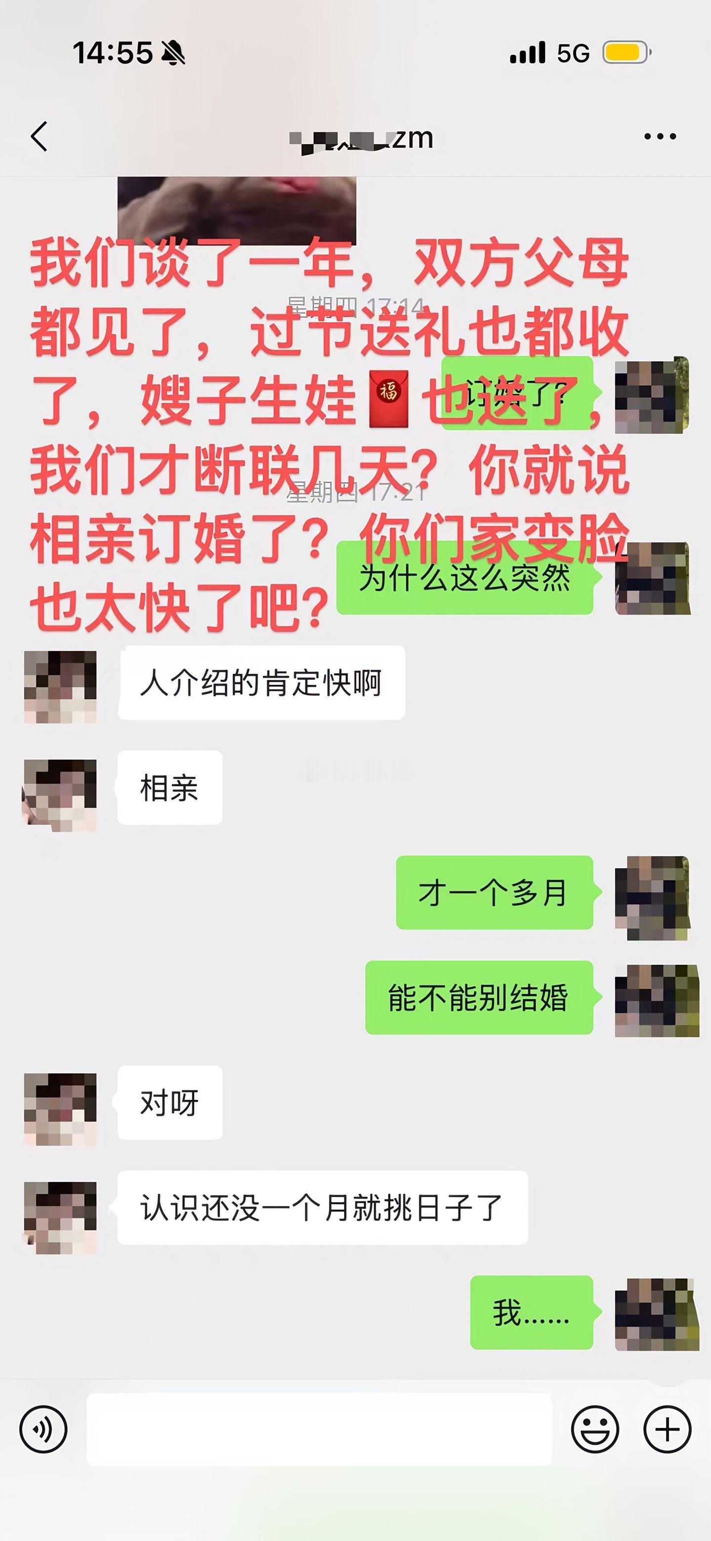 网友爆料,我们谈了一年,双方父母早都见了,过节送礼也都收了,嫂子生娃也送了,我们