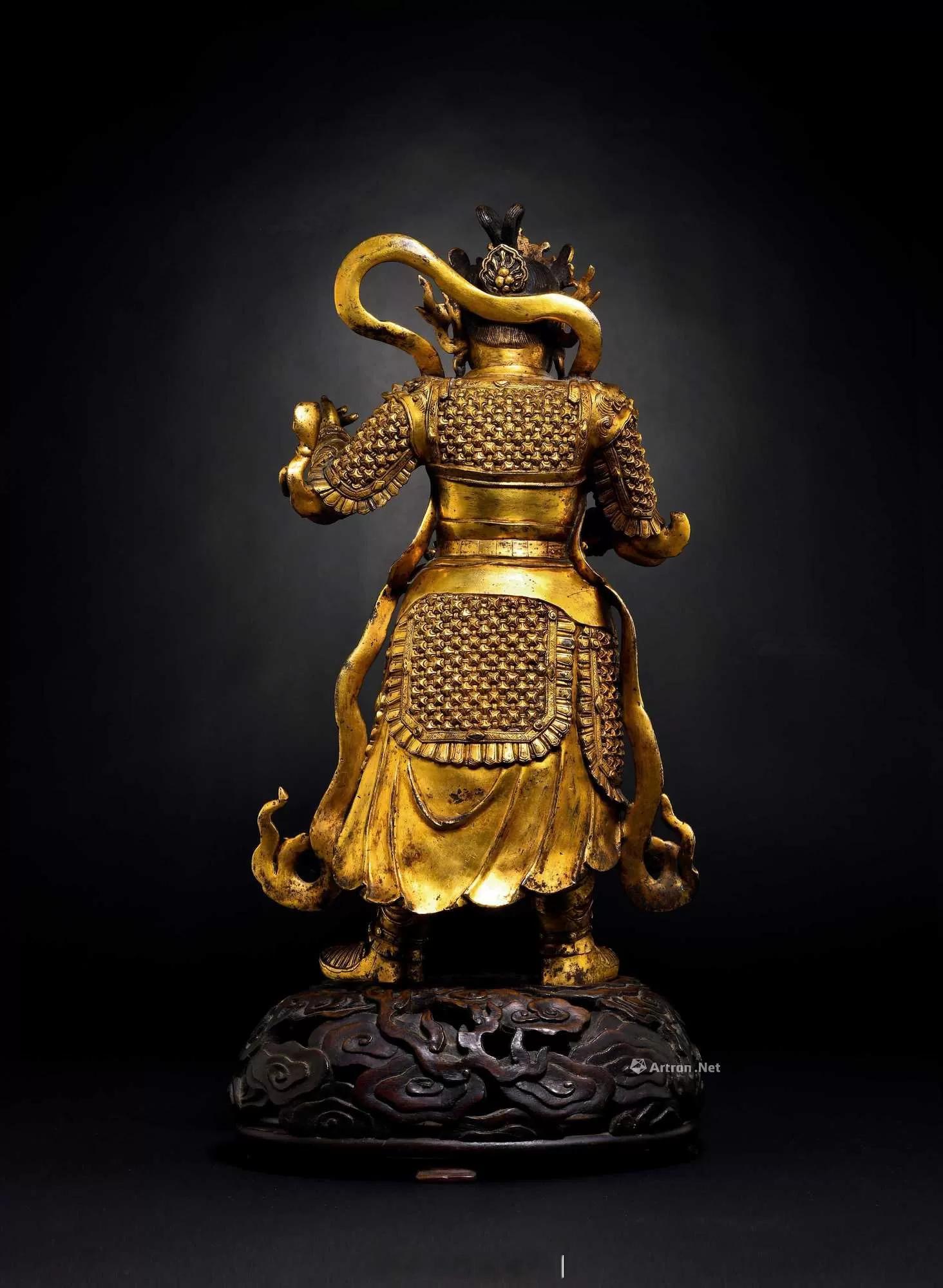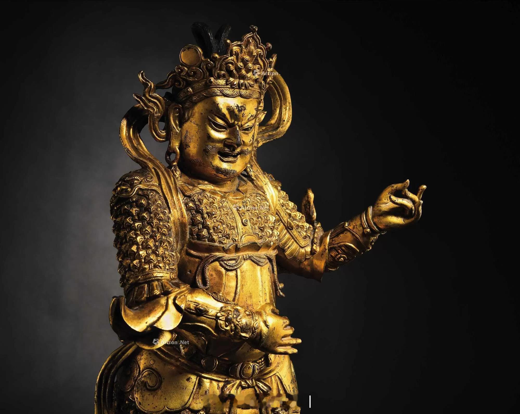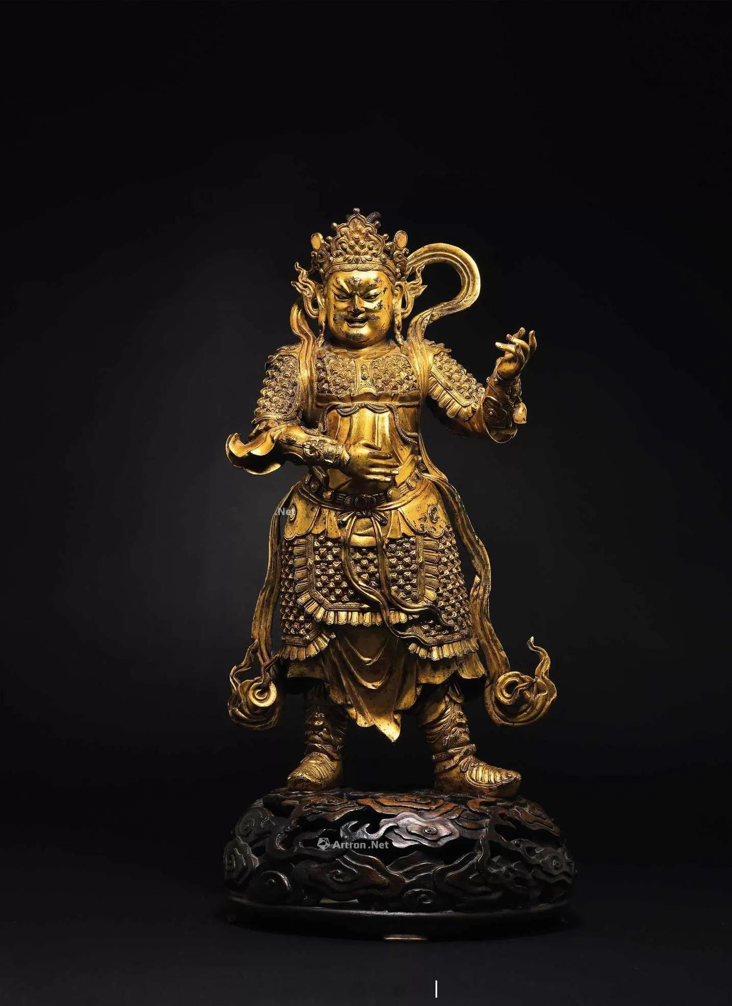 此尊造像所表现为四大天王之持国天王,其体量高大,工艺精湛,威风凛凛,生动鲜活,予人强烈视觉冲击。“持国”即以慈悲为怀,保护三千大千世界众生,护持三千大千世界国土,居于须弥山东黄金埵,为东方东胜神洲守护神。关于其形象据《陀罗尼集经》卷十一中记:尊身着绕天衣,尊左手伸臂下垂持慧刀,尊右手屈臂向前,掌中托宝慧珠。另据《般若守护十六善神王形体》所记:东方持国尊天王尊身青色,紫发,面显忿怒状。着红衣甲胄,手持大宝慧刀。除此而外,他还有一种形象为人们喜闻乐见,即手持四弦琵琶,寓意“调”也,所谓“持国天王宝号,琵琶端执当胸。震响梵音普被,法门永护无穷。”此尊持国天王造像,束发戴冠,宝冠高耸,结构复杂,冠面正中主藏宝象征端严殊妙、圆明光莹,面庞饱满,耳际宝缯飞扬,双眉上挑,眉端紧蹙,眼角细长,鼻梁挺直,鼻头宽阔,嘴唇与鼻翼同宽,张口轻笑,舌齿稍显,颧骨微隆,下颌圆润,唇周胡须短簇细柔。其身形魁梧,体态健硕,双手原持琵琶,左手高举持琵琶前端,右手拨动琴弦,虽然琵琶现已丢失无存,观其生动鲜活的手势,似乎悦耳琵琶声正从祂那灵巧指间传出。天王身披铠甲,甲片纹路排列繁而有秩,如磊石般高凸立体,胸前、腰际束带交结,腰佩革带,足蹬云头高靴,以威震四方姿态傲立祥云之上。肩部帔帛随风飘扬于脑后,自腋下顺势飘揺于身体两侧,显得轻柔而飘逸,与躯体紧裹之坚硬、厚重、凌厉铠甲对比鲜明。四大天王的形象是从印度佛像中吸收演变而来,早期的造像带有域外胡人形象。而这尊持国天王像完全是汉族人形象,制作工艺非常成熟,以及铠甲衣袍样式都为我们判断其年代提供可靠依据。类似风格题材作品,国内外博物馆中可找到为数不多案例。美国纳尔逊·阿特金斯博物馆所收藏“铜鎏金托塔天王”(图832-1),尺寸略小于本尊,含底座高35公分,馆方断代为元或明初,其造型特点、衣饰着装、金水质地等铸造工艺风格与本尊如出一辙,应为同一时期、同一产地之作品。此尊造像开脸极具特色,为典型“国”字脸,面部肌肉紧实,饱满而富有弹性,簇眉微怒,目光坚定而深邃,展露出护法神将之佛性光辉,其面部特征,可参考元至正二年,居庸关云台石阁之汉白玉持国天王像(图832-2),“云台石阁”原为元朝皇家寺院之属,类比两尊造像面部风格、威严高贵气质,可作为本品持国天王出自元代宫廷佐证之一。史料记载,元朝打败西夏国后,曾掳去大量西夏工匠(西夏当时以炼铜和手工业著称),故而元代造像作品中,常会带有西夏艺术风格,上述所提“居庸关云台石阁”为一例证,云台石刻用七种文字刻有经文,其中便有西夏文字。杭州飞来峰元代石刻韦陀立像亦可作为参考(图832-3)。西夏时期金铜造像类作品,可比较1986年出土于宁夏银川市新华街,现藏于宁夏博物馆之“西夏·天王像”(图832-4),高度57.5cm,立姿,着甲胄,愤怒相,应为南方增长天王,对比两尊天王造像头冠纹饰,正中均有仰覆莲花座托起摩尼宝,两侧均为如意纹和圆形图案装饰,两者之传承关系显著。西夏天王身形偏瘦但气势十足,而持国天王则壮硕而不显臃肿则更符合元朝时皇家审美情趣。另则,本尊持国天王以精炼黄铜,失蜡法分体铸造,此种铜质为业内公认元代宫廷造像所使用,铸造工艺纯熟,胎体适中,而后期由于铸造工艺下降铸造的造像大多笨重呆板,细节处刻画不够精细,结合多时代天王造像风格进行图像学对比,这尊持国天王应该是元代皇家造像。