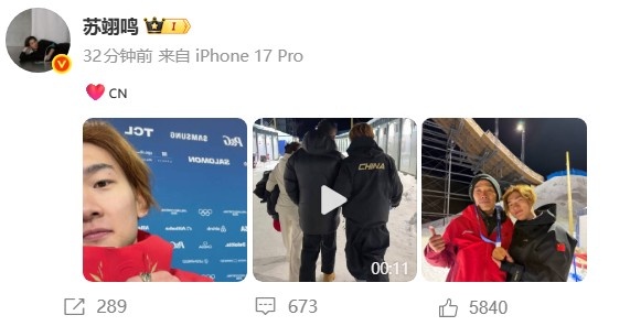 与此同时,苏翊鸣成历史首位两夺男子单板滑雪大跳台奥运奖牌选手。赛后苏翊鸣社媒分享照片,并配文: