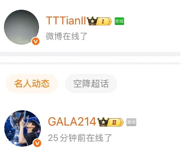 全上来看Bin哥美图Tian knight GALA等选手全部微博上线