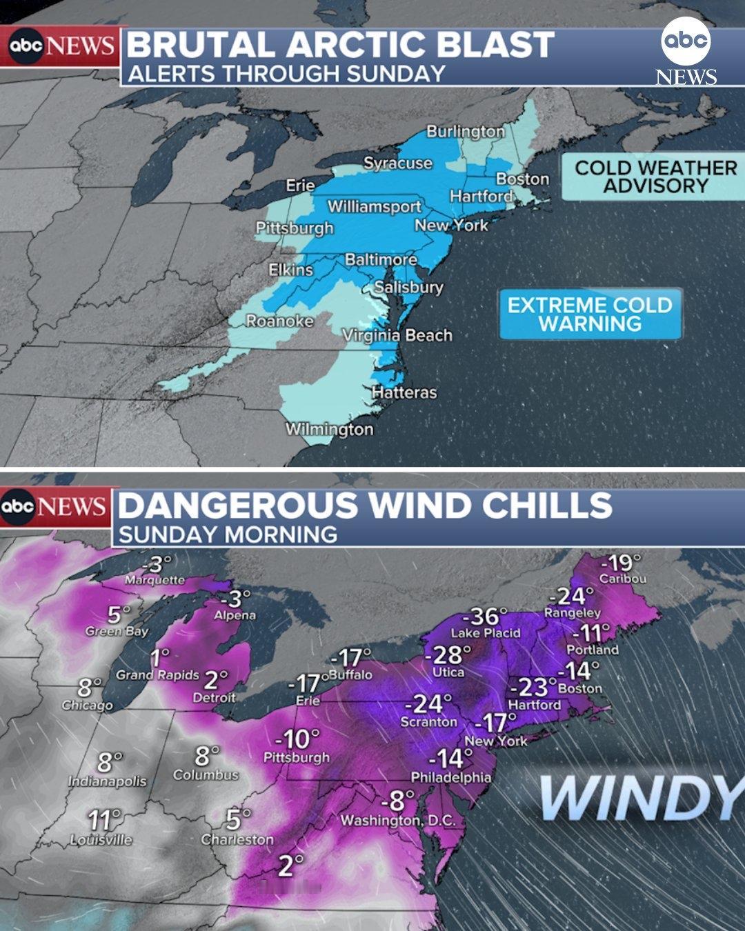 美国东部再迎极寒流 本周末,美国东海岸超过 8000 万人正密切关注一股强劲的北极寒流——东北部大部分地区已发布极寒警告。 周日将是该地区入冬以来最冷的早晨。