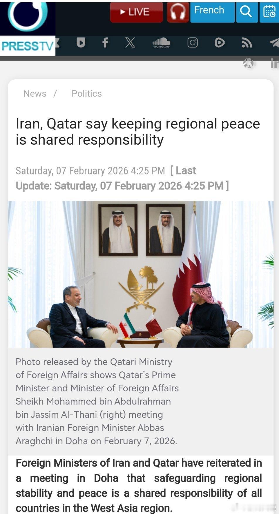 伊朗和卡塔尔两国外长在多哈举行的一次会议上重申,维护西亚地区的稳定与和平是该地区所有国家的共同责任。(伊朗官网)
