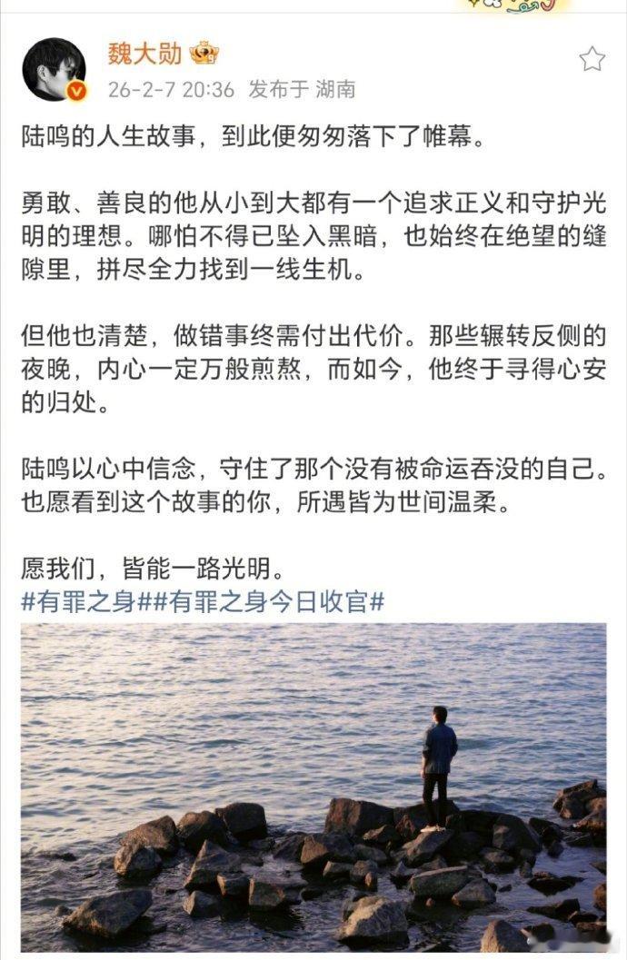 魏大勋陆鸣不说意难平的意难平魏大勋不说意难平的意难平 《有罪之身》陆鸣匆匆落幕,他的人生轨迹满是心疼与不甘,本就足够意难平。魏大勋温柔发文告别,通篇没提“意难平”,留白之处,全是无声的遗憾与后劲。 有罪之身