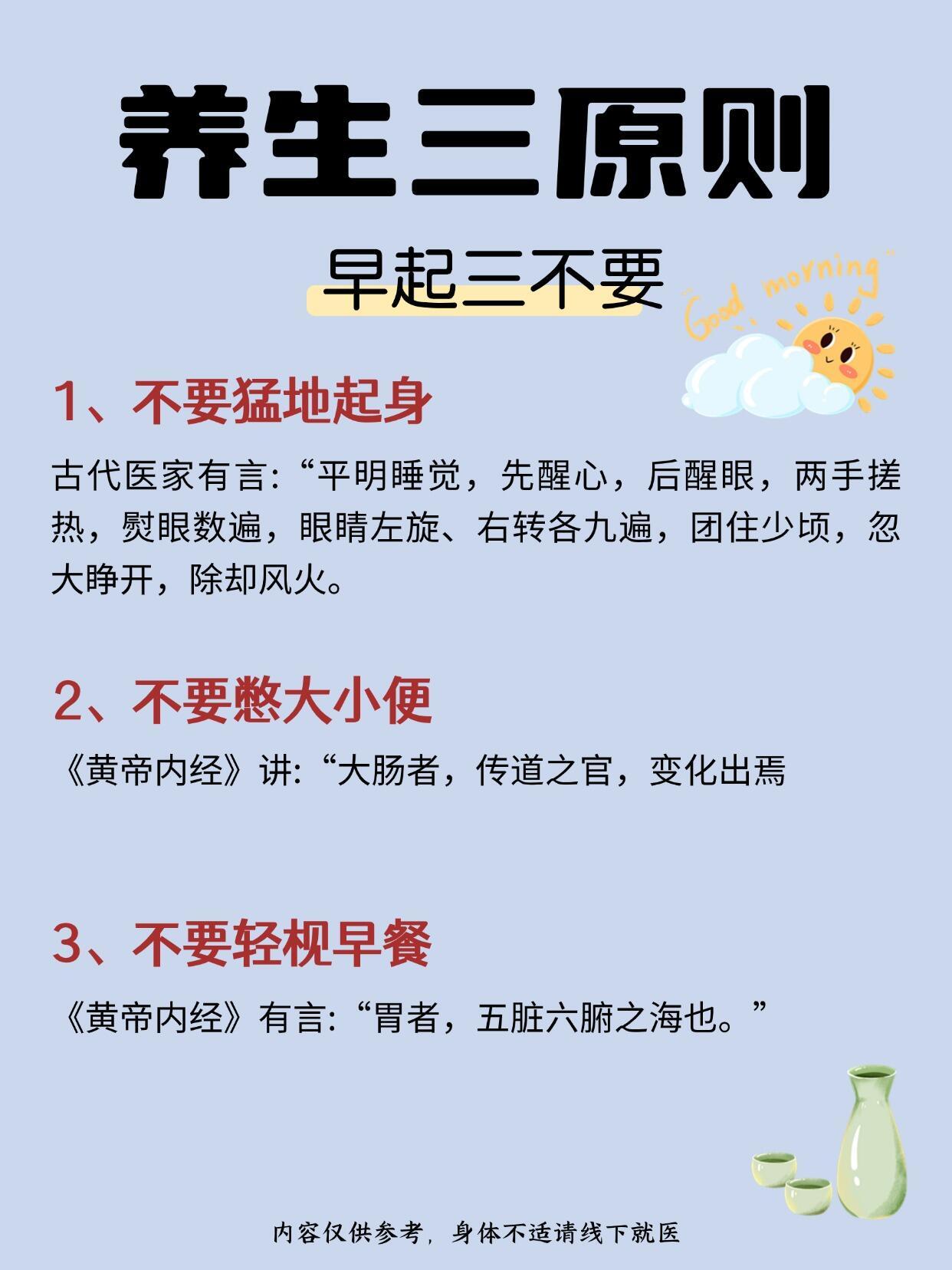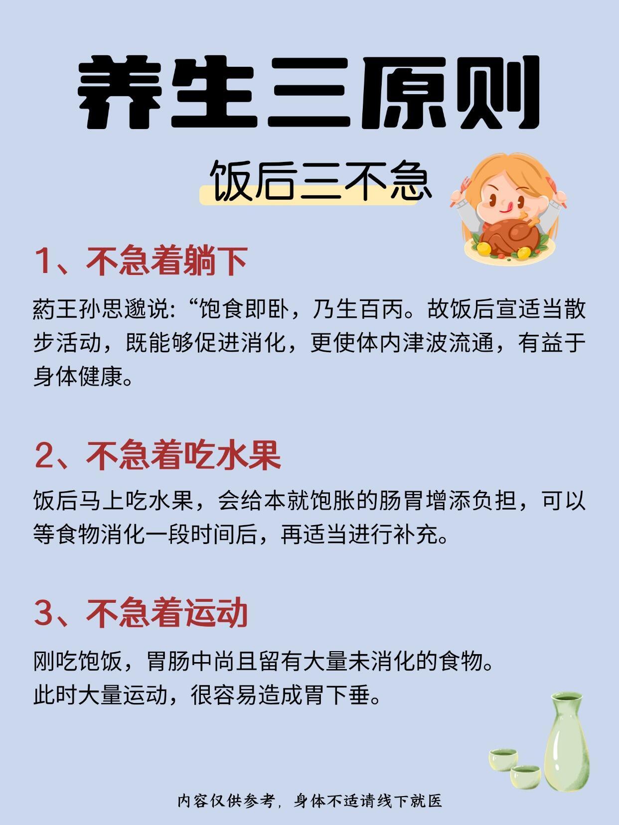 养生小知识|养生三原则1️⃣ 饭后三不急1、不急着躺下2、不急着吃水果3、不急着运动-2️⃣早起三不要1、不要猛地起身2、不要憋大小便3、不要轻枧早餐-3️⃣睡前三不宜1、不宜吃宵夜2、不宜劳累3、不宜思虑