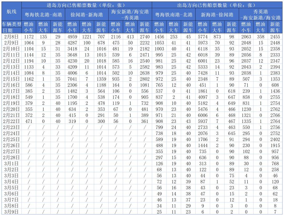 2月7日,琼州海峡客滚运输共发送航班358班次,运输旅客125117人次、车辆31252辆次。