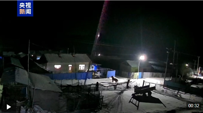 近日,在黑龙江省穆棱市共和乡碱场村,当地居民通过监控摄像发现东北虎进村。从监控看到,东北虎在街道上反复踱步,溜达了一圈离开,没有人员伤亡。