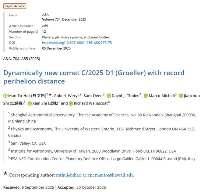 值得一提的是,中国科学院上海天文台等研究团队近日对即将到访内太阳系的彗星C/2025D1展开了深入研究,为人类探索太阳系起源提供了关键线索。