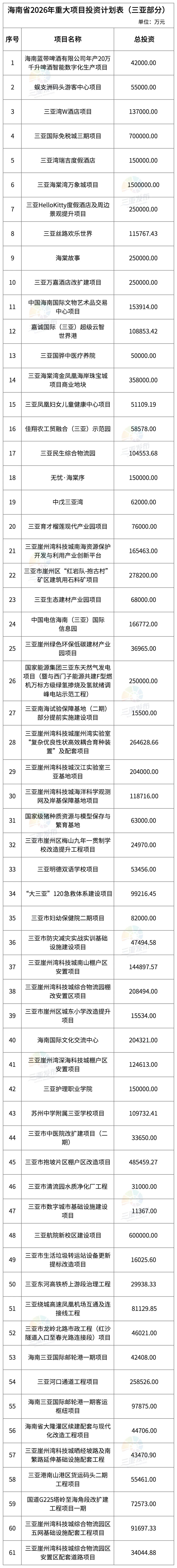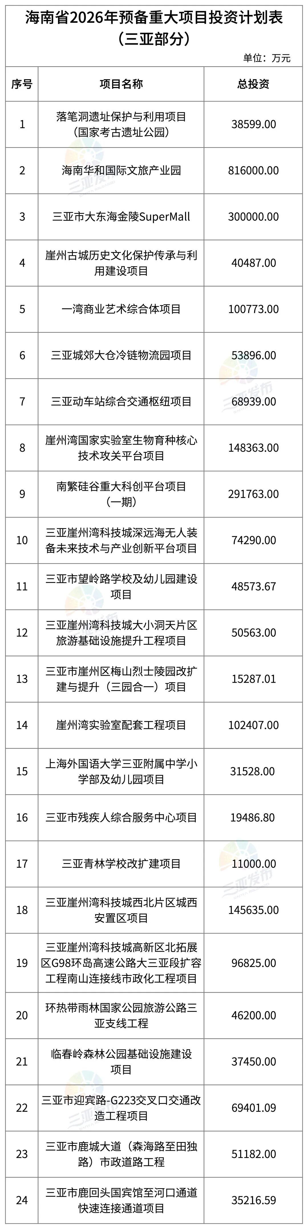 此外,投资计划还安排了160个预备项目,总投资2425亿元,为自贸港持续发展储备后劲。项目清单包括环热带雨林国家公园旅游公路三亚支线工程、上海外国语大学三亚附属中学小学部及幼儿园项目等。