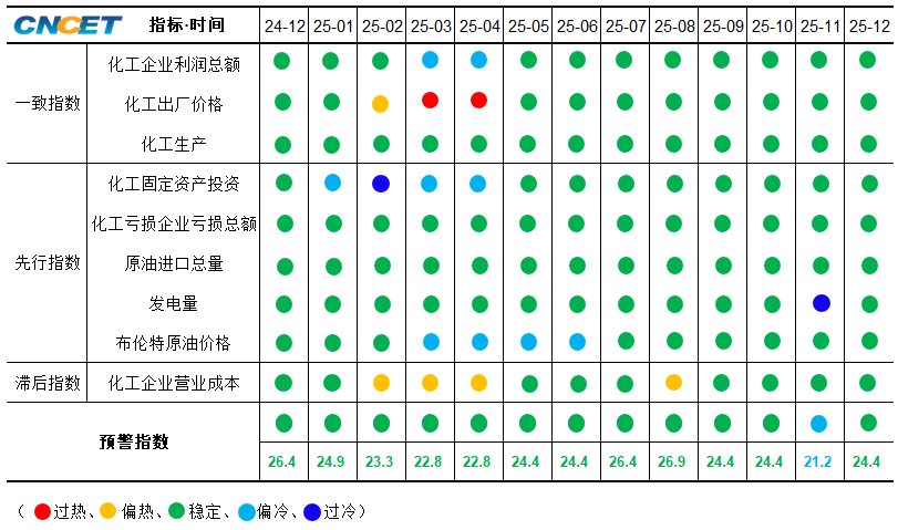 2025年12月份,化工消费需求不断恢复,行业生产稳定增长,行业亏损面下降至年内最低水平,利好化工行业景气回升,测算到2026年1月份综合预警指数初值为27.4,比2025年12月份上涨3.0点。