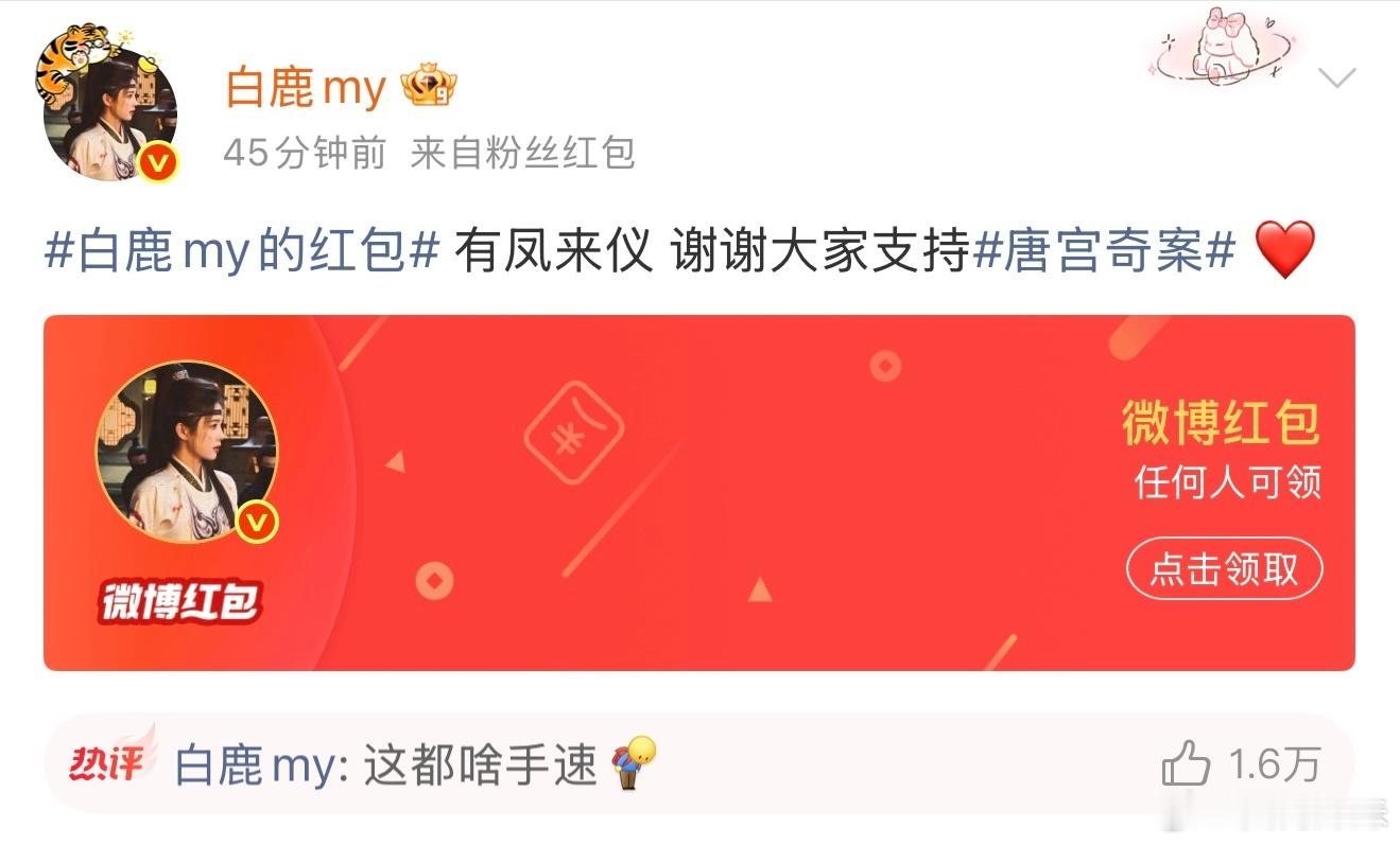 离了白鹿还有谁这样来宠我啊上一秒还在剧里探案,下一秒就来剧宣福利直接大手笔发五万块的红包,而且还特意提前发博提醒大家别错过,又大方又细心的白鹿上哪找!内娱宠粉天花板真不是随便说说,全是实打实的惊喜,这波操作属实把我拿捏了白鹿的宠爱从来都是实际行动派~