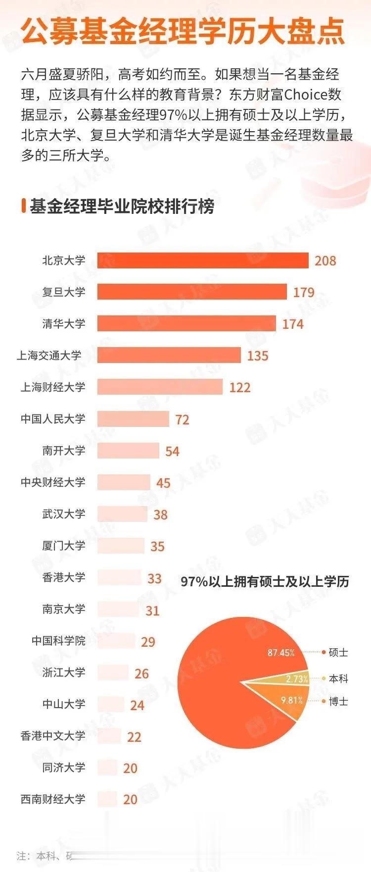 据不完全统计,最盛产基金经理的五大高校分别是北京大学、复旦大学、清华大学、上海交通大学和上海财经大学,在任基金经理人数分别为208人、179人、174人、135人和122人。中国人民大学、南开大学、中央财经大学、武汉大学、厦门大学、香港大学、南京大学也为公募基金行业输送了30位以上基金经理。此外,中国科学院作为专业性的研究机构,亦有近30位毕业生担任基金经理一职。