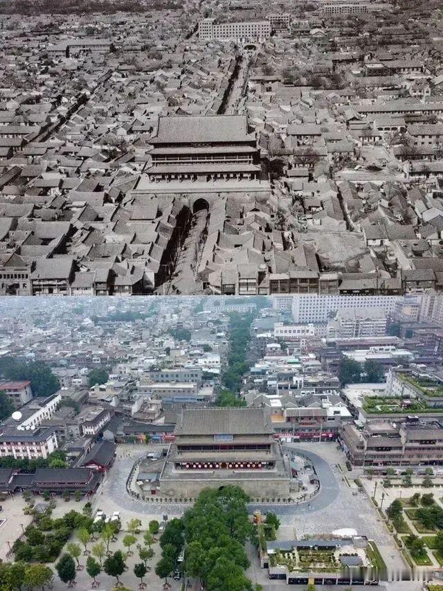 中外两个城市的今昔对比 左边是法国巴黎凯旋门的今昔对比,两张照片相隔大约100年,周围的广场以及12条放射状道路都没有太大变化。巴黎老照片 拿破仑凯旋门 右边是1960年与2021年西安鼓楼区域的对比照,可以看到少了很多古建筑,都变成了高楼大厦。 西安