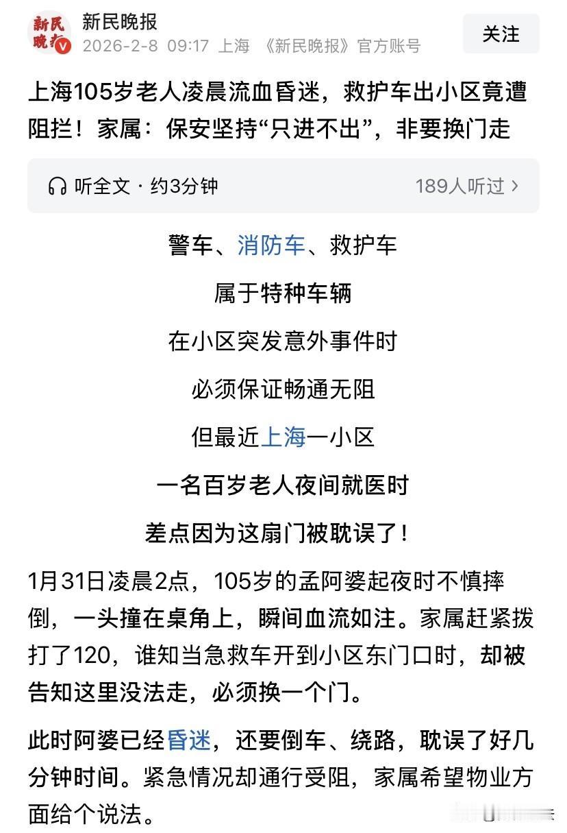 上海,105岁老人半夜起床上厕所时,不慎摔倒,一头撞在桌角上,瞬间血流如注。救护车赶到后,为了赶时间,决定走最短的路线,从小区平时只能进不能出的东门出去。谁料,小区保安死活不肯通融,坚持“只进不出”,不让救护车换个门出去。事后,虽然经过抢救老人已经没有什么大碍,但是老人家属难以释怀,认为人命关天,制度是死的,人是活的!质疑小区保安的做法。 据悉,1月31日凌晨2点,105岁的孟阿婆起床上厕所时,不慎摔倒,一头撞在桌角上,瞬间血流如注。 孟阿婆的家人被孟阿婆闹出的动静惊醒,起床看灯看清孟阿婆的状态后,顿时吓坏了,赶紧拨打了120。 没过多久,120的救护车便赶到现场。 而等救护人员将孟阿婆抬上救护车时,孟阿婆已经陷入昏迷状态。 为了赶时间,救护车司机决定走最短的路线,从小区平时只能进不能出的东门出去。 谁料,到了小区东门后,小区的保安就是不肯放行,坚持小区东门只能进不能出。 眼见与小区保安纠缠也不会有什么结果,救护车最终绕路出门,这一耽误就是5分钟。 经全面检查,孟阿婆此次撞伤虽然没有伤及颅内,但也造成严重的皮肤软组织裂伤,额头更是留下了长达7厘米的豁口。 目前,虽然经过抢救已经没有什么大碍,回到家中休养。 但是孟阿婆的家人每每想到当时保安的做法便难以释怀!“当时情况紧急,又是深夜,为什么不能人工抬杆?”“这样一绕路,又要花掉5分钟”“制度是死的,人是活的呀”。 对此,小区物业经理表示,特种车辆在紧急情况下是不受“只进不出”规定约束的。 当时值班的保安则解释,当时不是不开门,是电脑系统开门、遥控钥匙开门全部失灵了,打不开。 可电脑系统开门、遥控钥匙开门是两种互不相干的开门方式,记者在现场也并没有发现门禁系统故障的迹象。 对此,网友纷纷表态,不少人认为保安太死板了! 还有不少人表示,保安就是喜欢用最小的权力来最大的为难人!生命第一,什么理由都不是阻拦救护车的理由! 那从法律上该如何看待此事呢? 1、时间就是生命,给救护车让路,就是为生命让路。这既是道德自觉,也是法律要求。 《道路交通安全法》第53条规定,救护车执行紧急任务时,可以使用警报器、标志灯具;在确保安全的前提下,不受行驶路线、行驶方向、行驶速度和信号灯的限制,其他车辆和行人应当让行。 《治安管理处罚法》第61条第(三)项更是明确规定,阻碍执行紧急任务的消防车、救护车、工程抢险车、警车或者执行上述紧急任务的专用船舶通行的,处警告或者500元以下罚款;情节严重的,处5日以上10日以下拘留,可以并处1000元以下罚款。 物业的制度大不过法律,涉案保安的行为看似是在履行职责,实则不仅是对生命的冷漠,而且已经违法。 2、《民法典》第942条规定,物业服务人应当按照约定和物业的使用性质,妥善维修、养护、清洁、绿化和经营管理物业服务区域内的业主共有部分,维护物业服务区域内的基本秩序,采取合理措施保护业主的人身、财产安全。 《物业管理条例》第46条规定,物业服务企业应当协助做好物业管理区域内的安全防范工作。发生安全事故时,物业服务企业在采取应急措施的同时,应当及时向有关行政管理部门报告,协助做好救助工作。 物业对小区业主的人身、财产安全负有相应的安全保障义务,涉案保安作为物业的员工代表的物业,阻拦救护车的行为,其实也是物业未经安全保障义务的表现,物业也难辞其咎! 万幸没有造成严重的后果!涉案保安和物业应该庆幸!避免再出现类似的行为! 3、这事您怎么看?欢迎在评论区留言,与大家一起交流您的看法! ------ 关注@安律说法 案例中看人生百态,法律中寻破局之法!