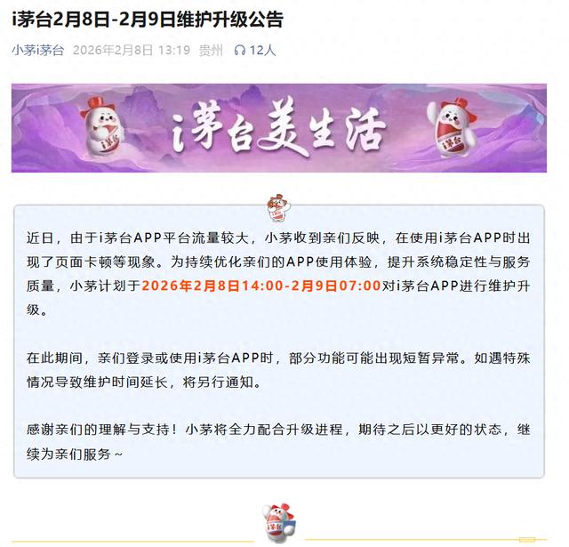 [大河财立方消息]2月8日,贵州茅台自营电商平台“i茅台”发文称,近日,由于i茅台APP平台流量较大,用户在使用i茅台APP时出现了页面卡顿等现象。为持续优化使用体验,提升系统稳定性与服务质量,i茅台APP计划于2026年2月8日14:00-2月9日07:00进行维护升级。在此期间,用户登录或使用i茅台APP时,部分功能可能出现短暂异常。