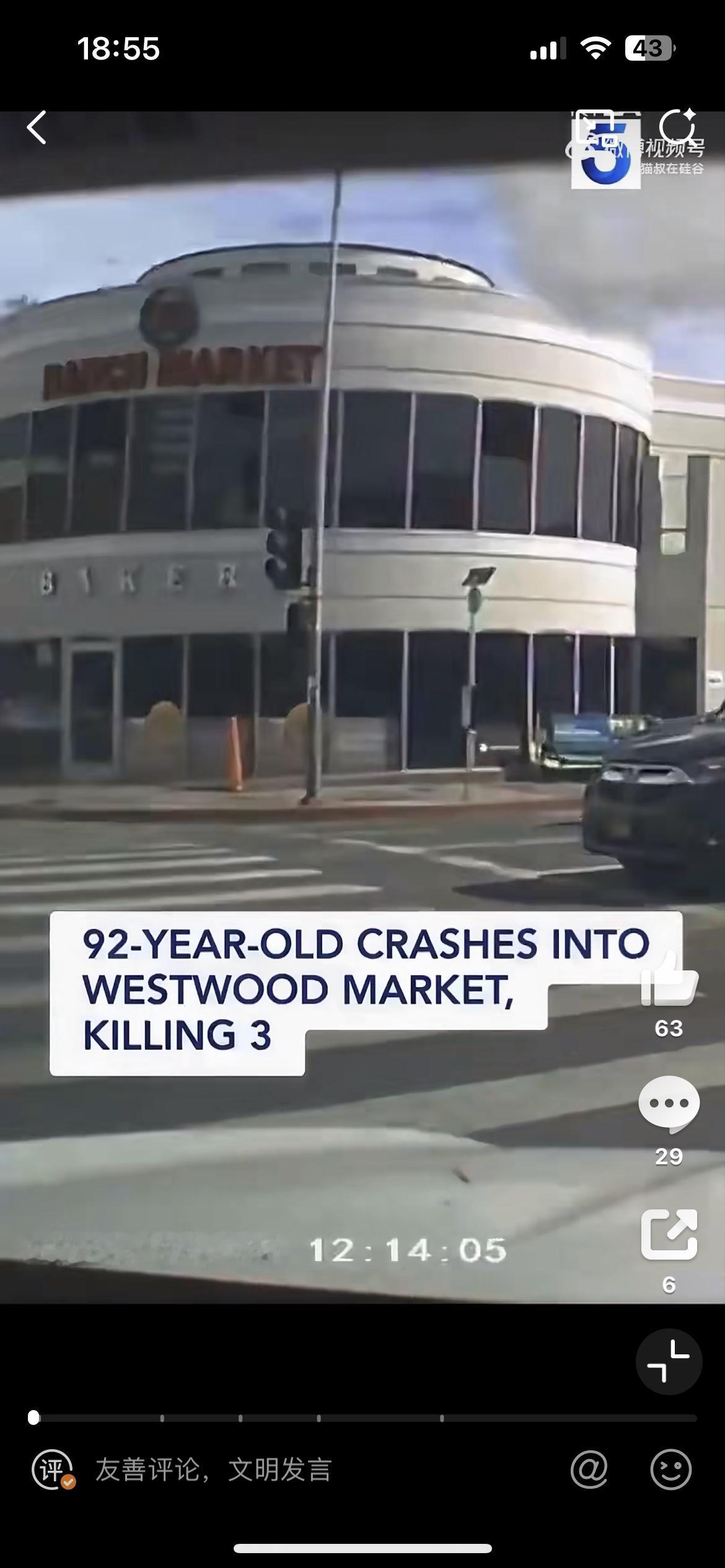 92岁美国老太驾驶丰田车冲入华人超市,撞死3人,伤6人,92岁还能开车这就是不负责任了。事发2月5日,一92岁老太驾车和自行车发生碰撞,老太惊慌失措,误把油门当刹车,以超过100迈的速度冲入路边的华人超市大华99,超市里当时购物的人很多,导致3人当场撞死,6人受伤的重大交通事故。闯红灯撞死人 老人撞车