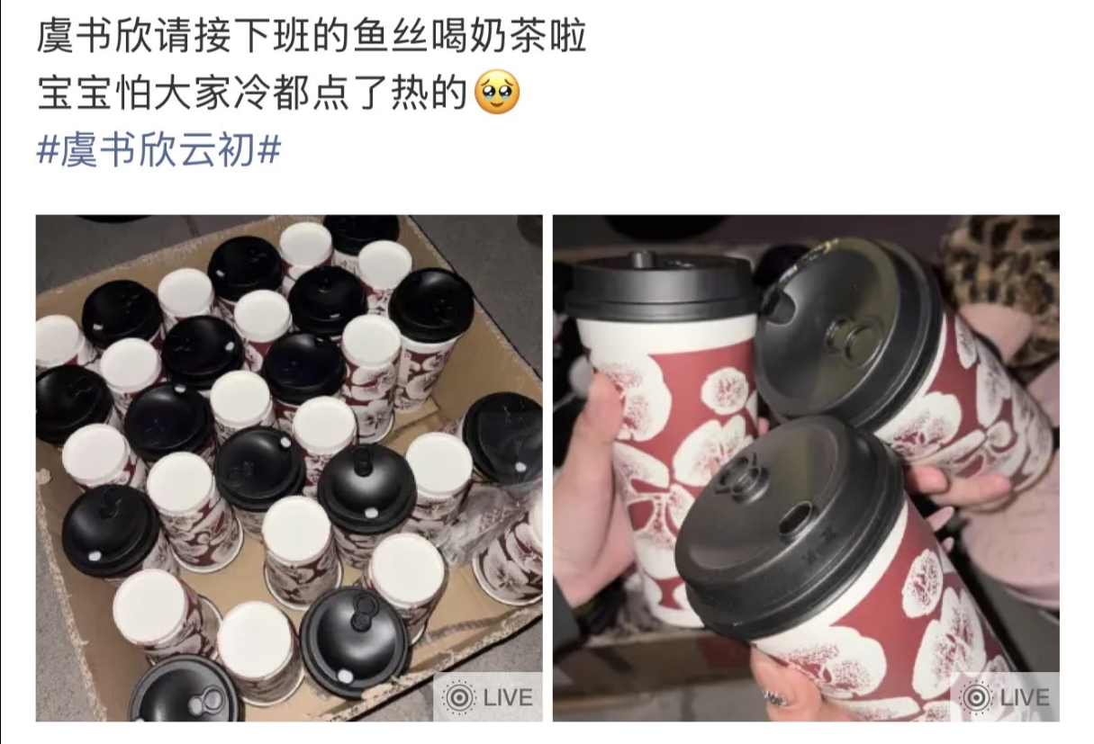 虞书欣逆应援请粉丝喝奶茶啦,天气虽然冷,但是奶茶和小石榴的心是暖暖的