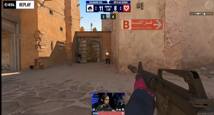 第二局MOUZ钢枪,Spirit直接抱团从A大进攻A区包点!MOUZ想从脚下突烟回防,被donk咖喱三杀接完了!2-0!