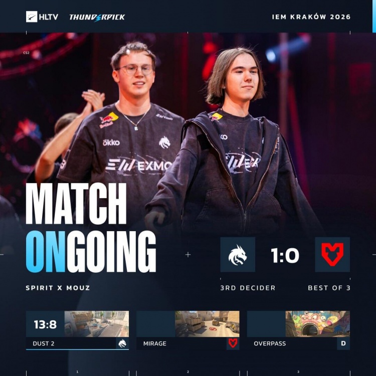 直播吧2月8日讯CS2重点赛事IEM克拉科夫来到最终决赛日,今天的首场比赛是Spirit和Mouz的季军赛!