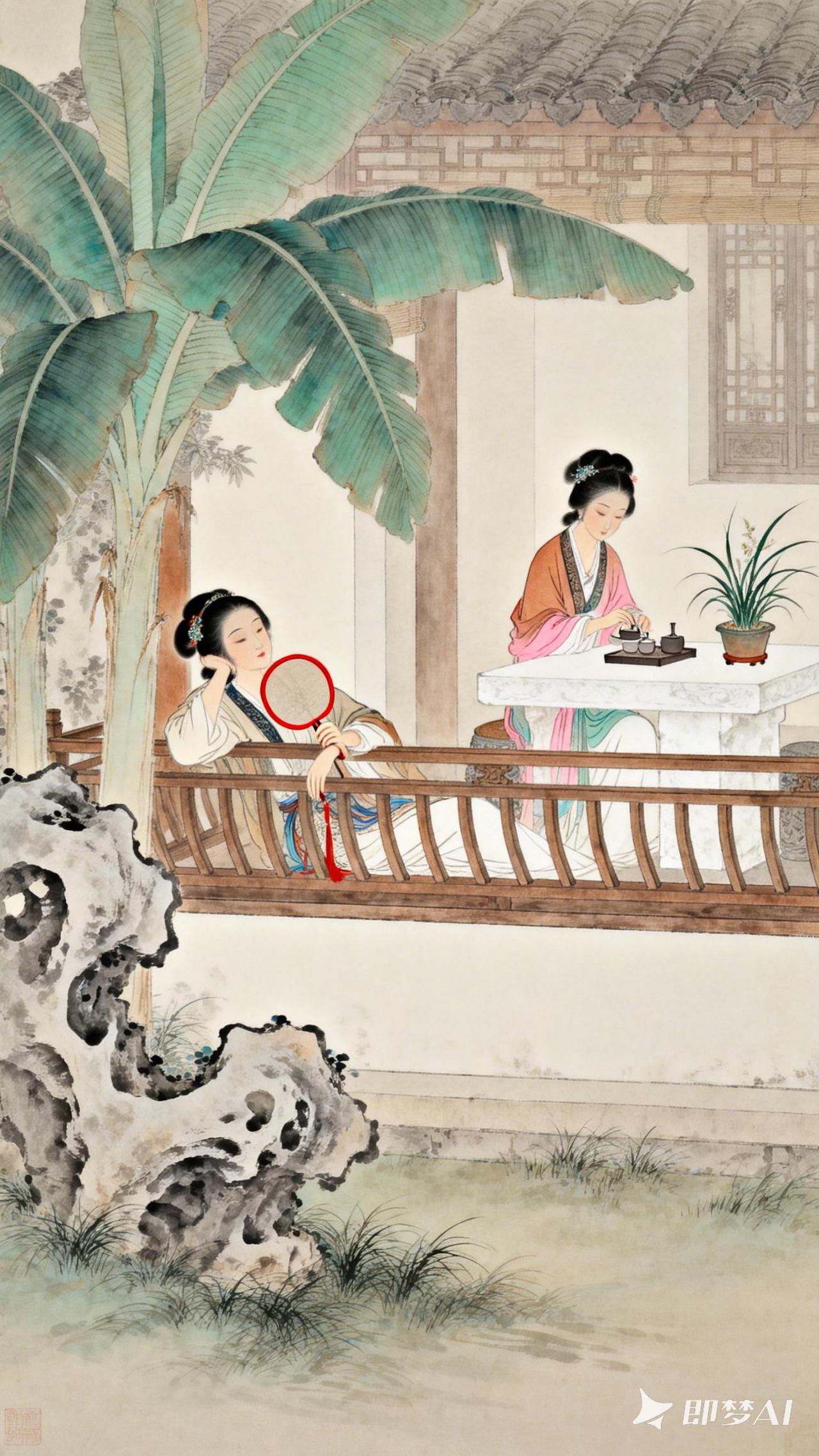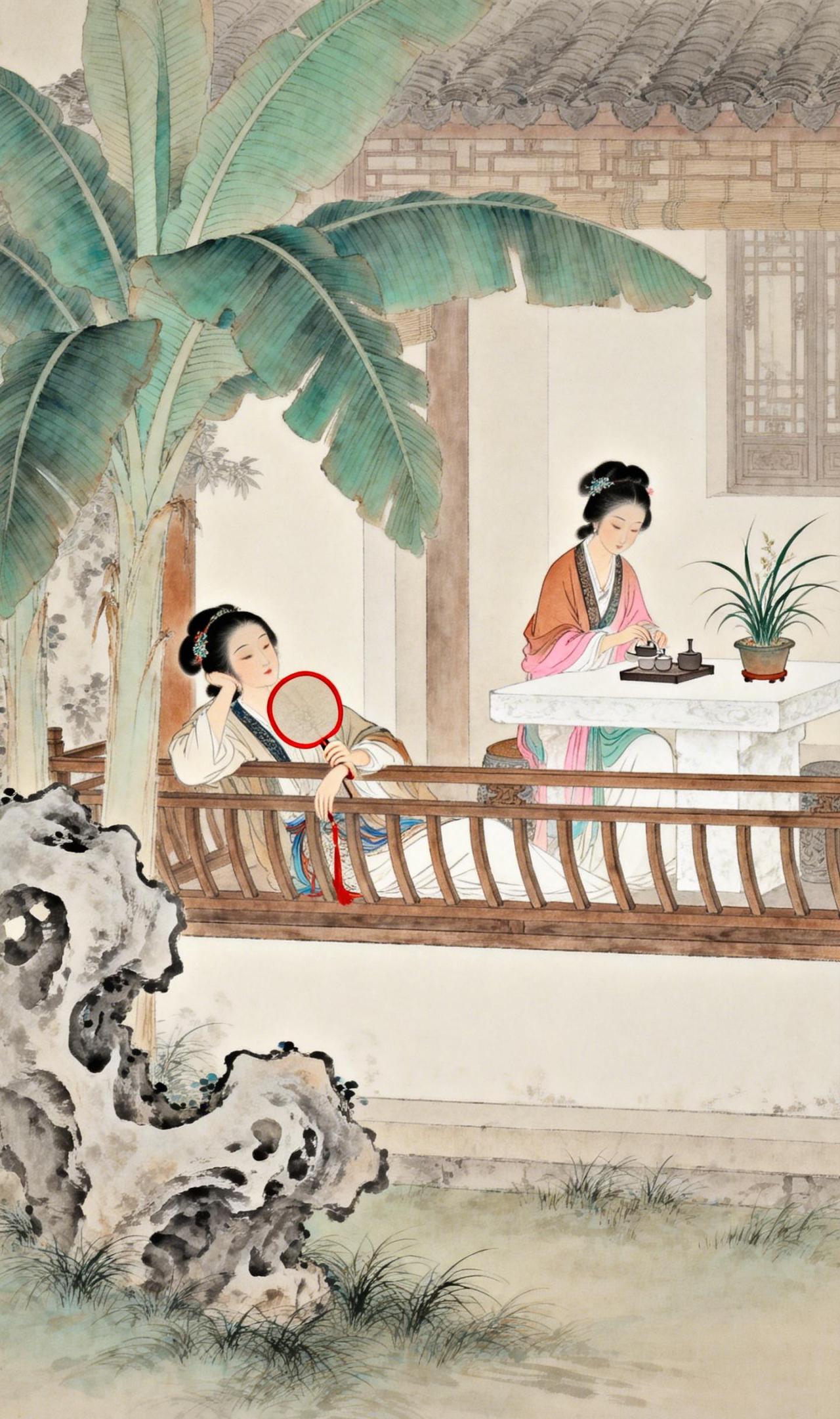 蕉荫茶韵仕女图 工笔细描的庭院时光里,芭蕉叶缘垂落清响,竹影在石台上轻轻晕开。执扇仕女慵倚阑干,团扇摇起的微风,牵动了额前碎发与衣角轻纱。另一侧,煮茶的女子低眉敛袖,壶中泻出一线江南烟雨——水痕在空中凝成剔透的弧,缓缓注进青瓷盏中。 蕉叶与竹枝在画绢上颤动起来。不是风动,是千年前那个夏日的呼吸,透过丝帛与矿物彩,正沿着仕女指尖的弧度,沿着茶烟升起的方向,苏醒成一段可听可见的东方梦境。时光就此定格在瓷盏将满未满的刹那,所有声响都化作了青绿与素白的深浅斑驳。 古画 仕女图