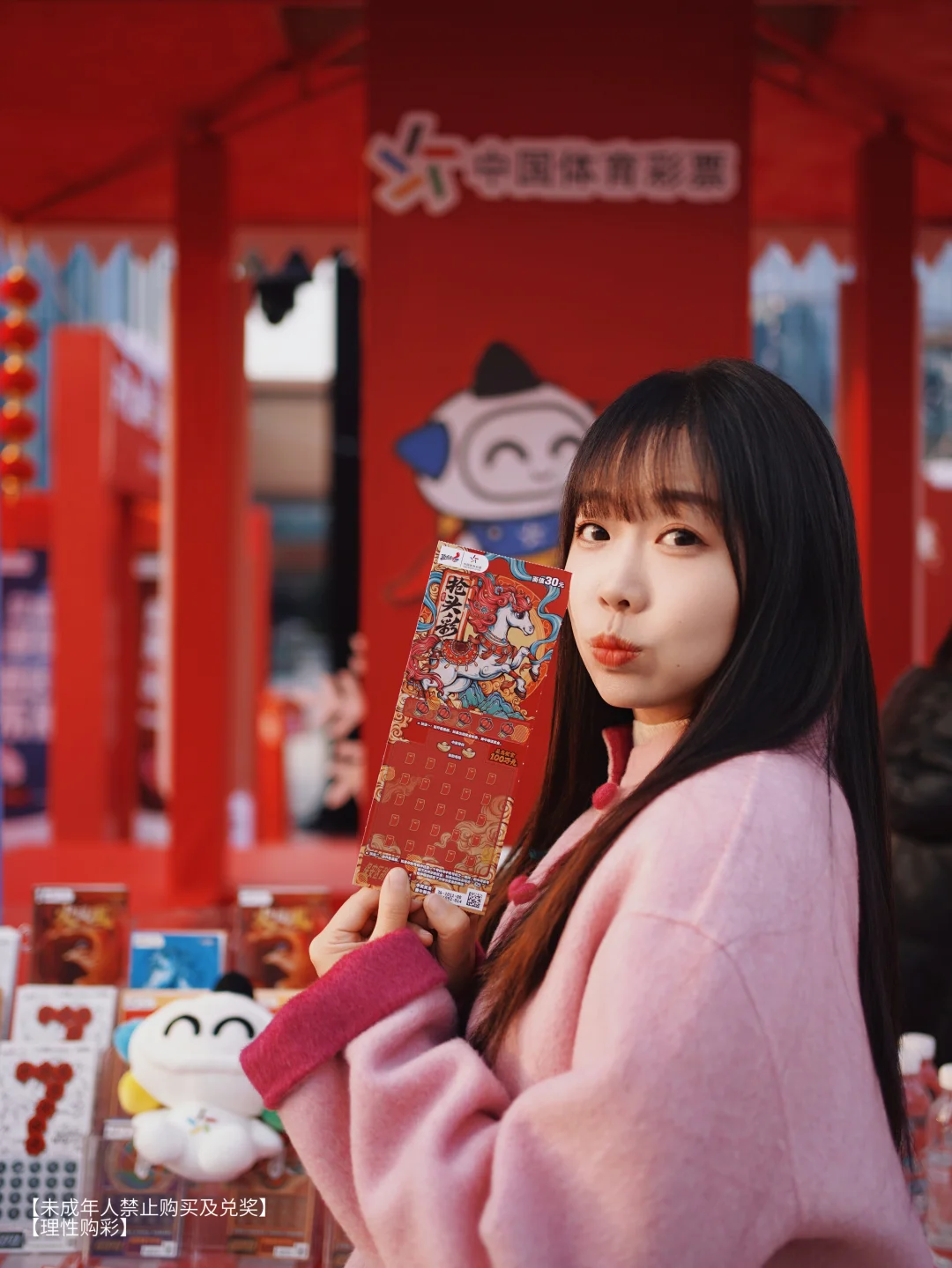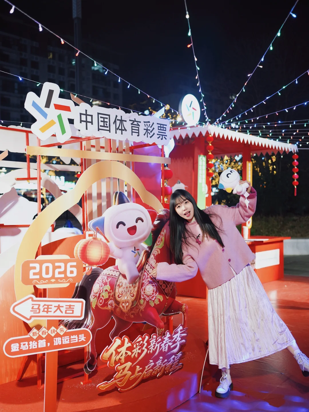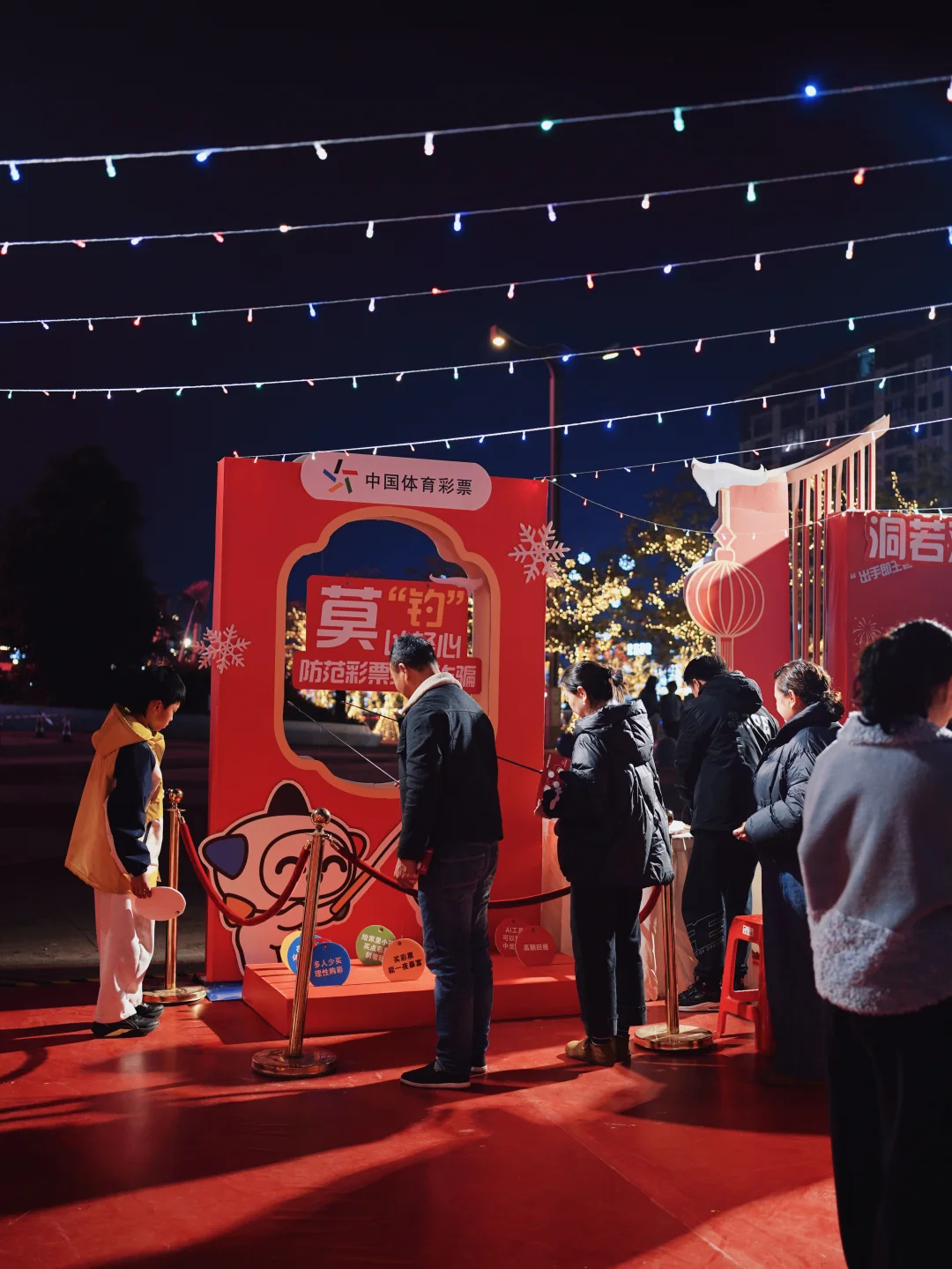 还没等走进彩灯大世界,我们就在门口的广场上,偶遇了一个年味拉满的“体彩新春季”市集。红红火火的布置,一下子就把我们吸引了过去。